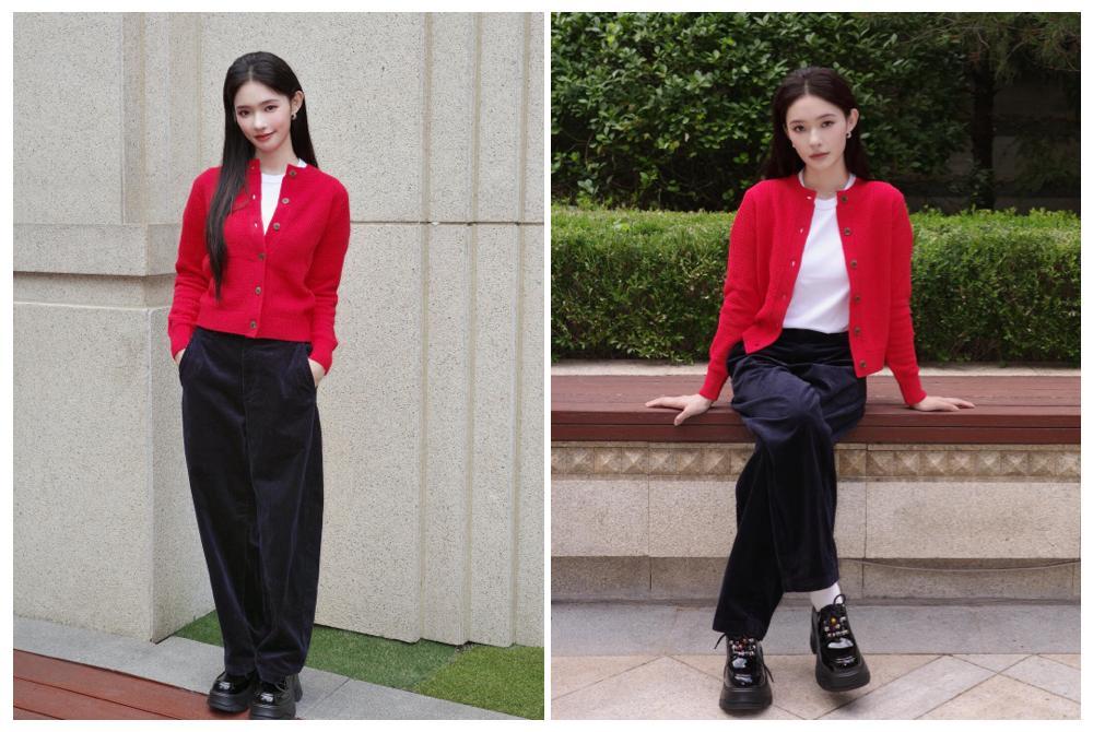 林允這身造型則很適合日常穿着,燈芯絨彎刀長褲的褶皺和表面的肌理充滿暗影的光澤,上身搭配珊瑚紅色開衫,形成強烈色彩對比,醒目卻不突兀。一絲不苟的黑長直髮與適度濃重的眼妝,更是讓整體造型簡明乾淨,極具個性。