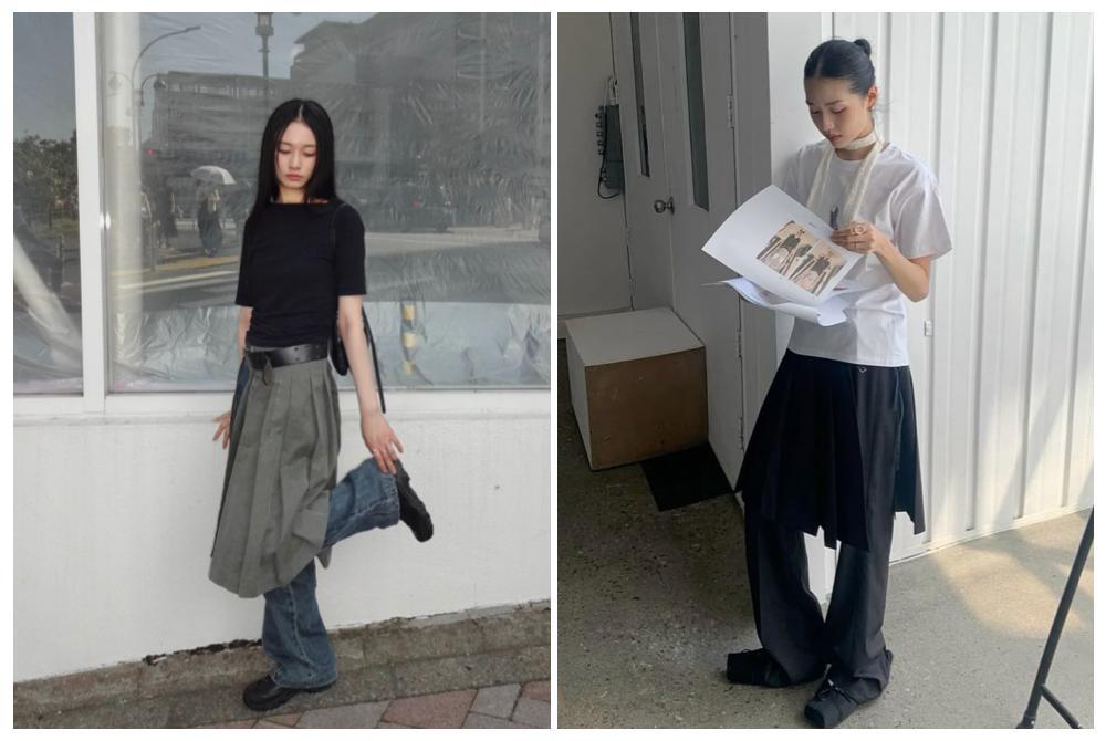 百褶裙與長褲的疊穿也很令人眼前一亮。裙身利落的褶襉打破單調,爲造型注入斯文冷靜的氣質。無論是通勤或日常,這一搭配都能輕鬆提升層次感,沉穩卻不失時髦。