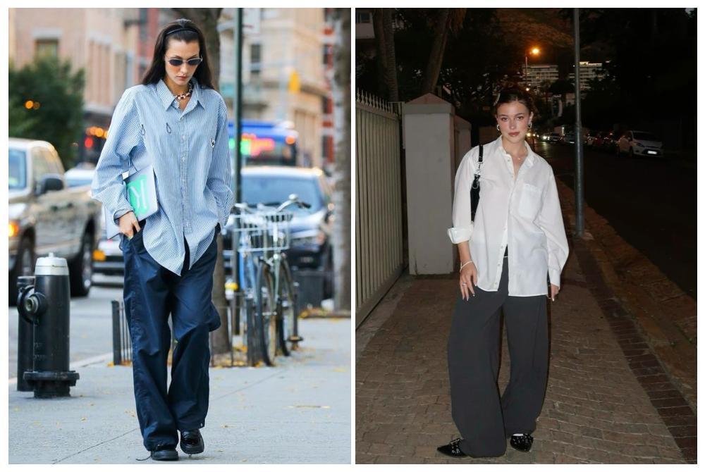 寬鬆襯衫與闊腿長褲的組合,堪稱舒適穿搭的典範。整體造型鬆弛有度,尤其是自然垂墜的衣襬,低調內斂中透出些許清冷氣質,既不拖沓也不刻意。