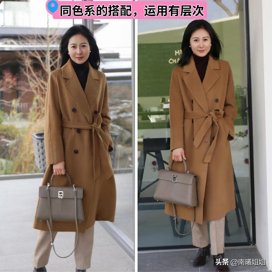 大地色系的搭配最經典的當然就是同色穿搭了,如果在當下的這個季節當中,我們運用疊穿,又或者是上下系列的穿搭,那麼還是要體現出一定的視覺對比的,推薦大家可以運用大地色系當中深淺不一的兩款顏色或者三款顏色來進行組合。