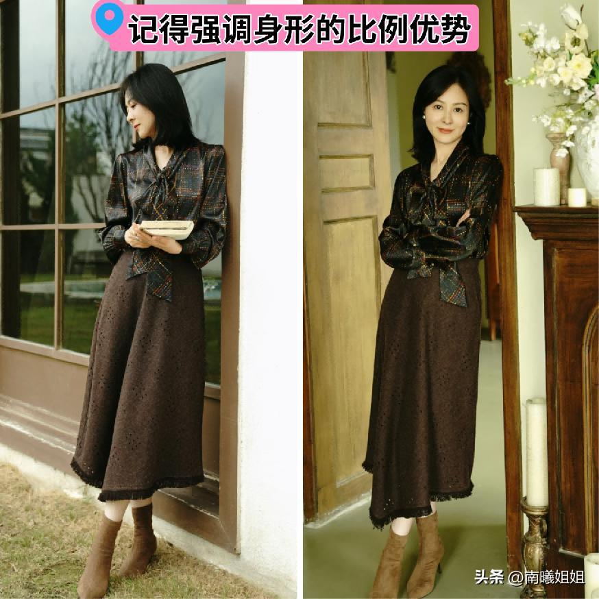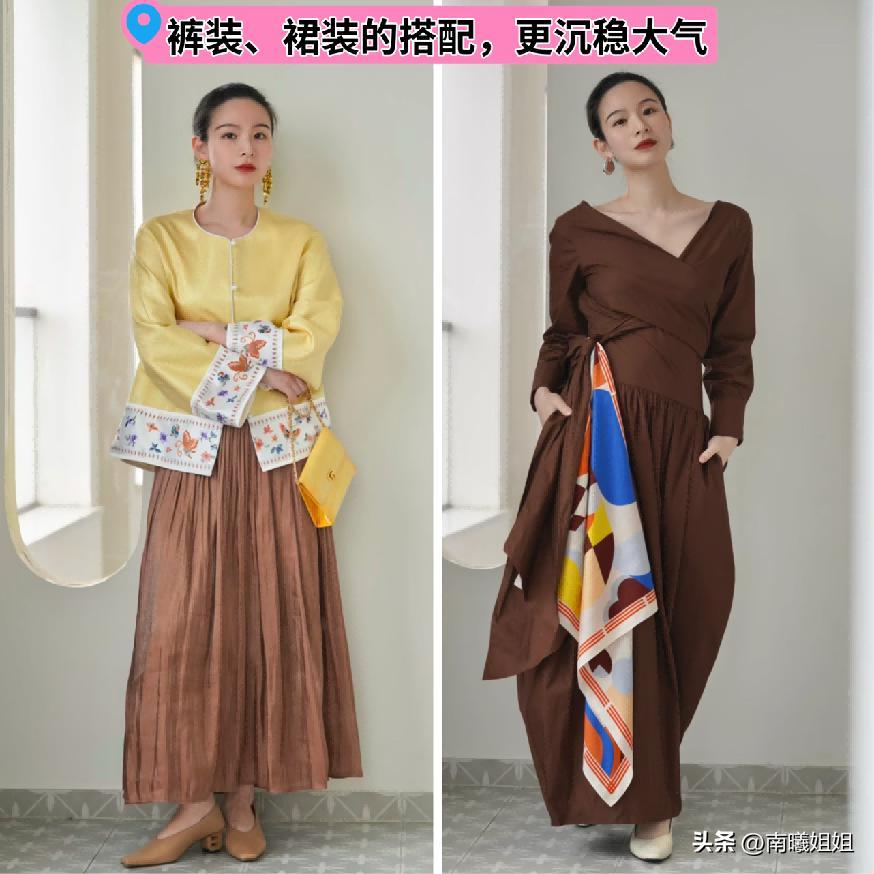 第2類非常推薦進行運用的單品就是像長款的褲裝以及裙裝的系列,呈現出來的氣質狀態也會更加的沉穩大氣一些,而且不管你的腿部狀態是什麼樣的,只要版型選對了,大地色系當中的任何一類顏色上身的時候都可以優化和勾勒出我們更加流暢好看的線條輪廓的走向。