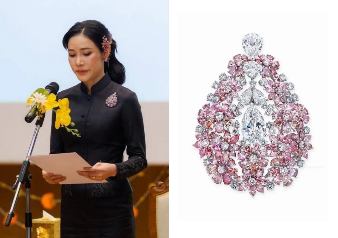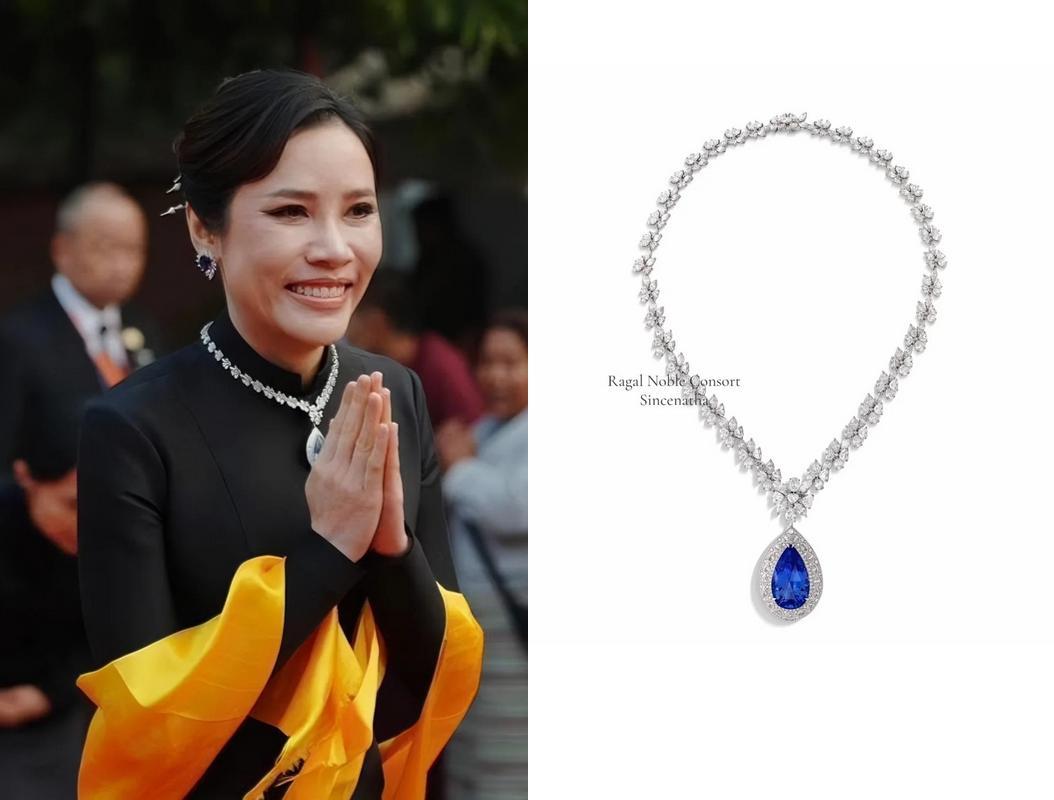 最重磅的是一條JAR藍寶石鑽石項鍊,盡顯深邃沉穩,組合上象徵泰王的黃色絲帶,主打一個有權有勢。
