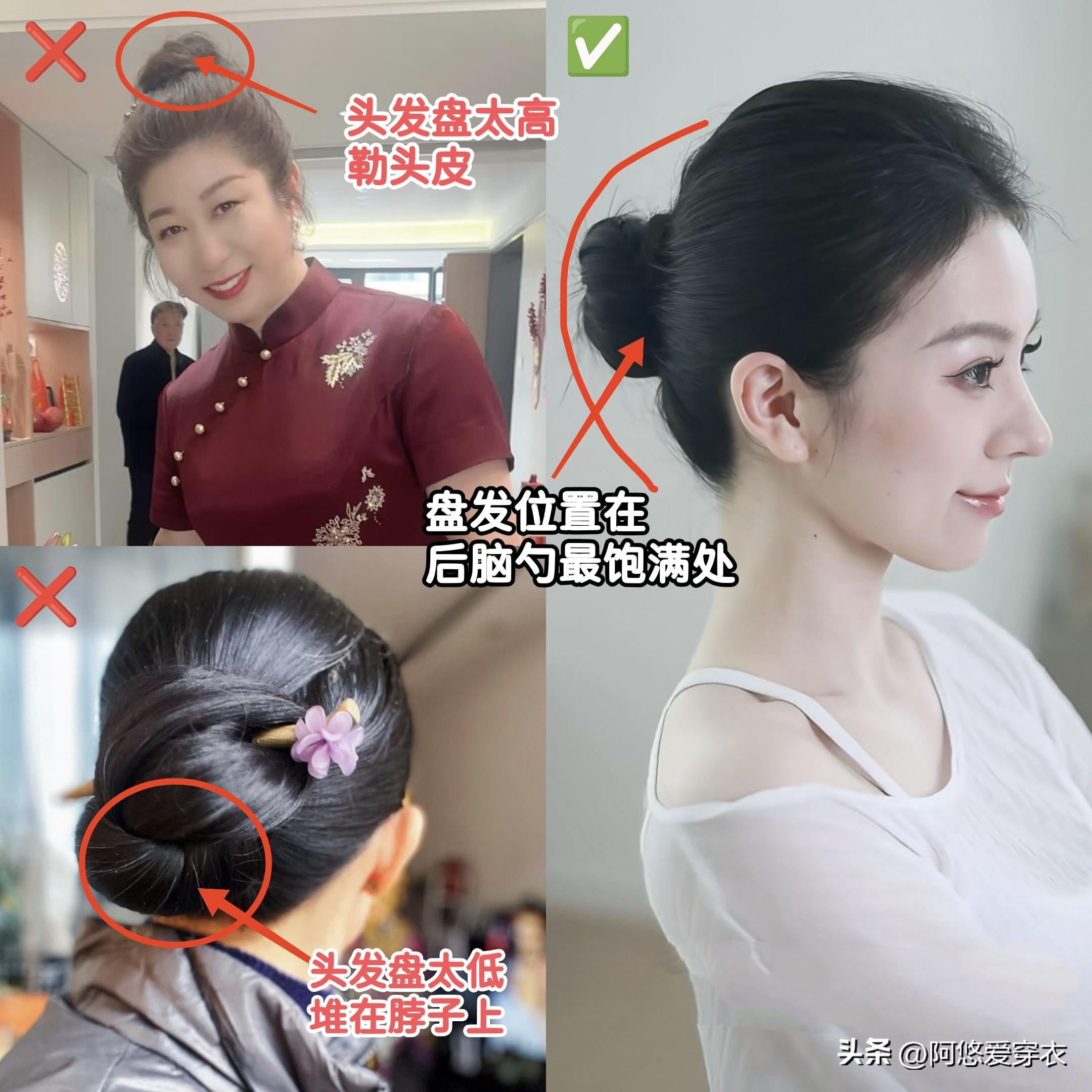 我們可以先從最簡單的“髮型”入手,千萬不能像你平時一樣把頭髮盤得很高,這樣會勒頭皮,也不能盤得太低,把頭髮全堆在脖子,看上去會很虎背熊腰。