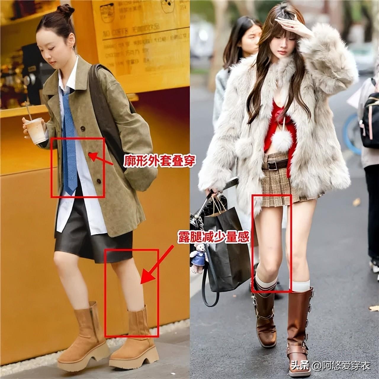 要是不知道如何解鎖顯瘦還優雅得體的搭配,可以跟着深圳的女孩們嘗試薄款短裙和長筒靴的搭配,上半身的厚外套滿足保暖需求,下半身搭配一條薄的短裙修飾腰臀比例,然後踩上一雙長筒靴,用修身的靴筒塑造出纖細的腿部線條,看着比例好還不臃腫。如果你身材比例一般,還可以選尖頭和帶跟款的長筒靴,進一步延長你的雙腿。
