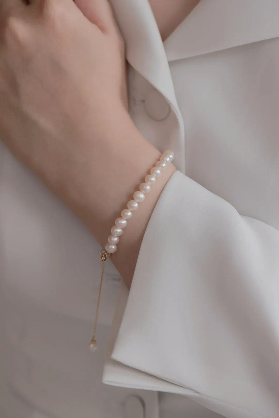 同款3號珍珠手鍊也很美麗,晶瑩剔透珍珠組成小體量的手鍊,14cm的長度外加5cm的調節鏈,滿足一切尺寸需求。