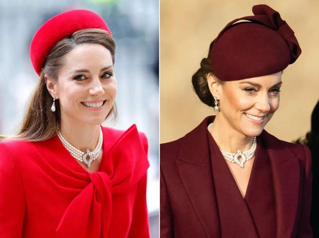 紅色穿得好是驚豔,穿不好容易過火,但凱特這種“紅配珠”的搭配方案,堪稱不動聲色的高級感。而這種搭配珍珠的思路,在王室其實是一代代傳承下來的。