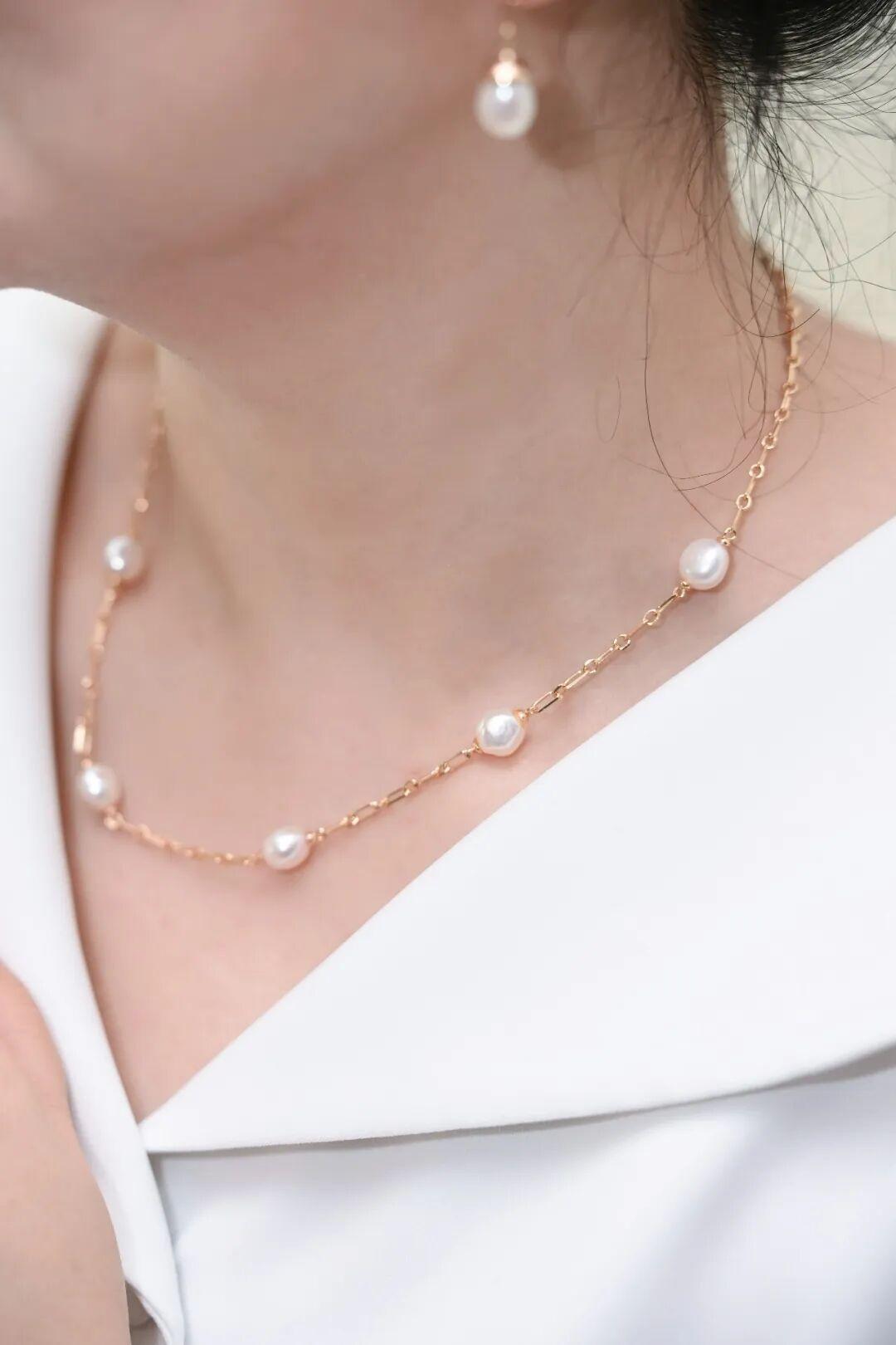 珍珠選用8mm左右的天然淡水珍珠,每一顆都閃着那種厚實的強光,巴洛克異形珍珠的獨特美感就在於它沒有兩顆是完全一樣的。