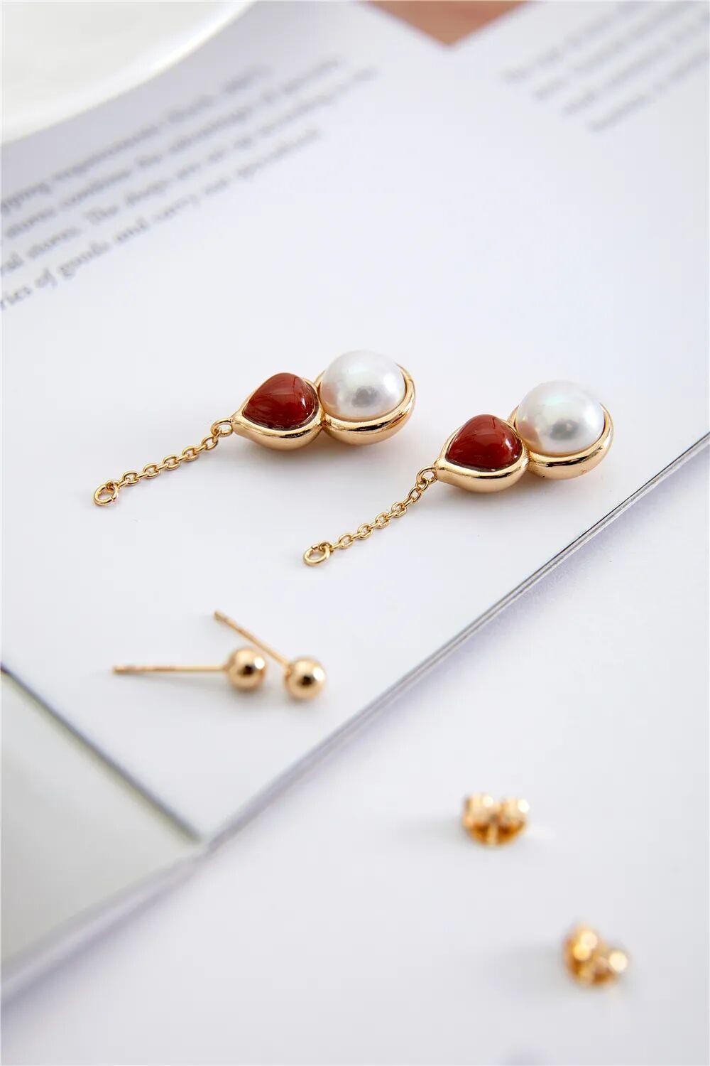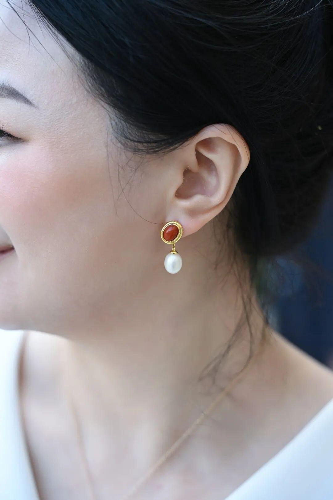 還有這對耳線,南紅裝飾採用了橢圓形切割,還原了南紅本身的圓潤柔和,耳線下端連接着一顆8~9mm的米形珍珠,垂墜感很好。爲了滿足不同的需求,耳線還專門設計出了1cm和5cm兩種長度。
