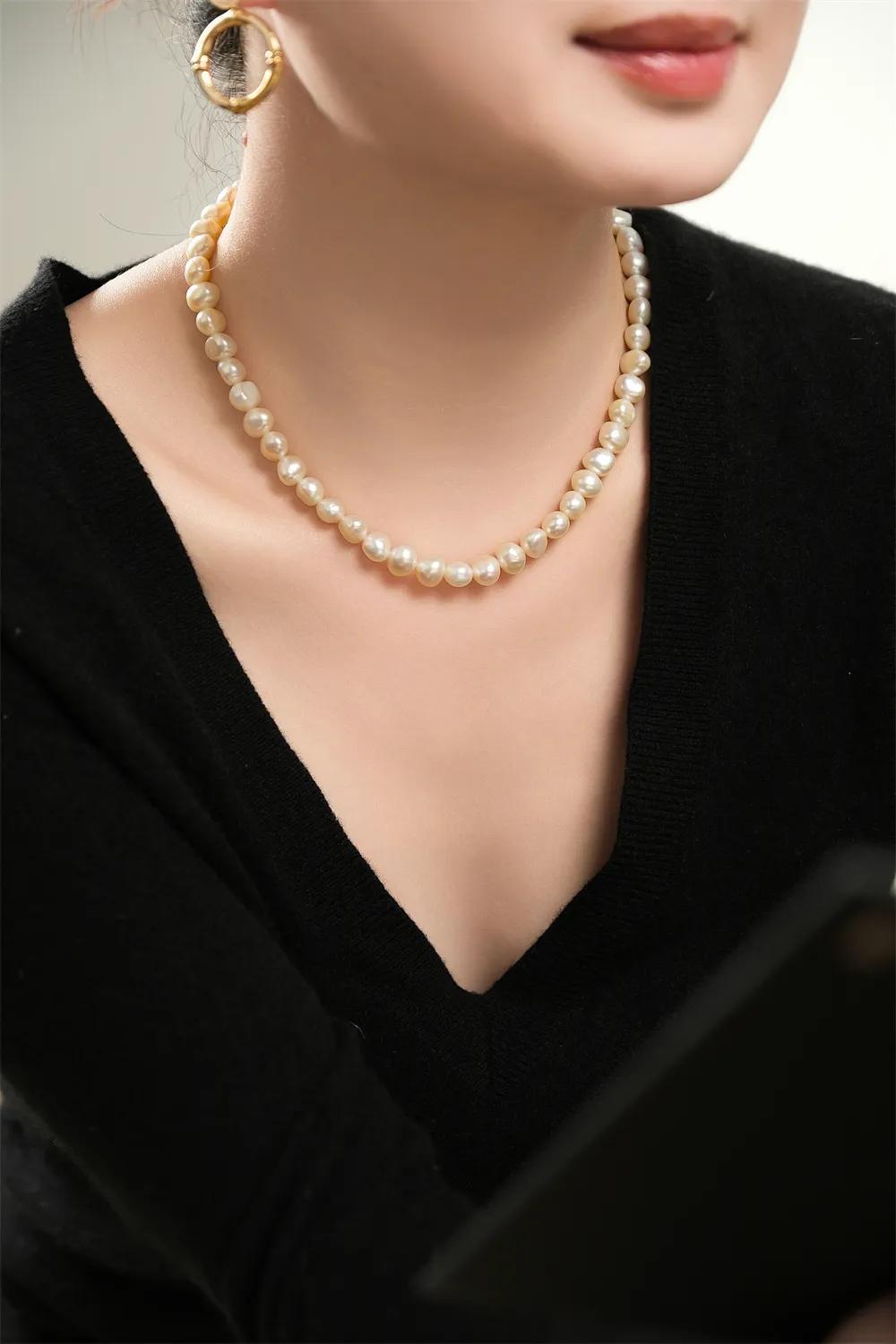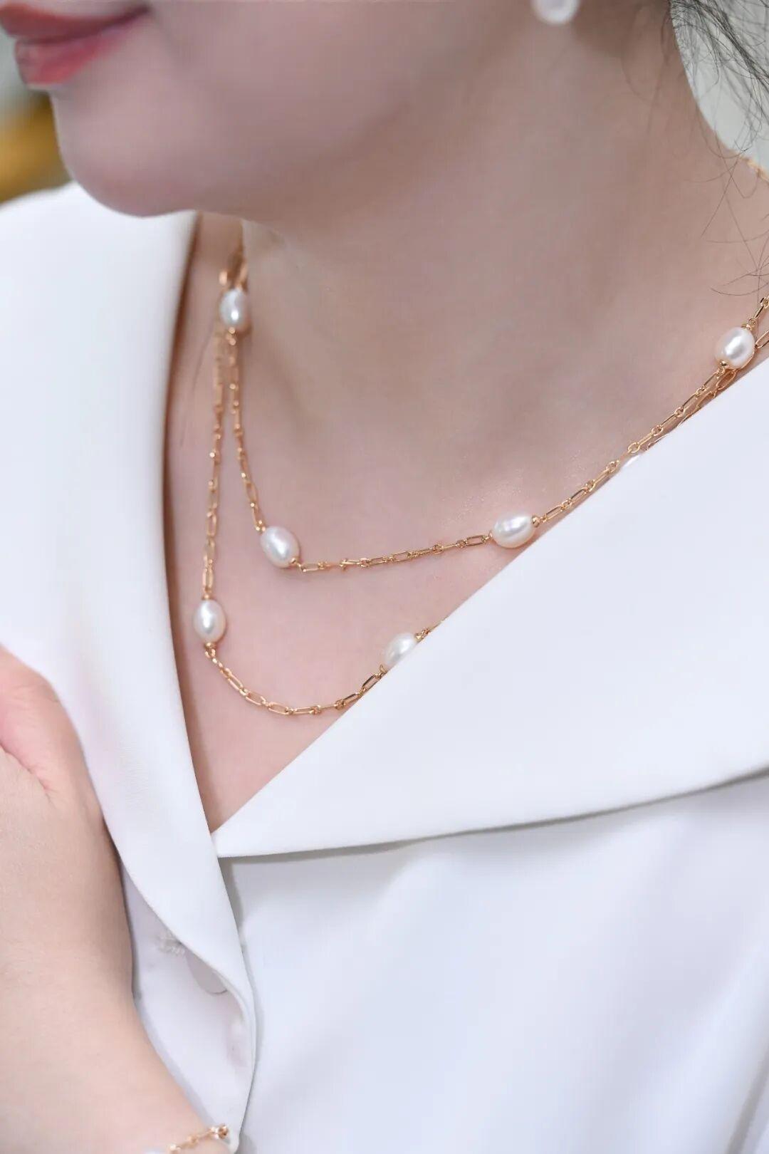 7-8mm的珍珠大小適中,既有存在感又不會顯得過於張揚。巴洛克珍珠那種不規則的天然美,賦予了這款長鏈一種溫婉大氣的“富家千金風”感,是一件能壓得住場子的單品。