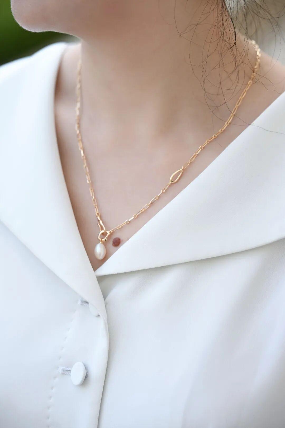 項鍊長度約50cm,珍珠尺寸達到了8-9mm,體量感十足。非常適合那些追求個性、不隨大流的職場女性。簡單一件白襯衫,解開兩顆釦子,露出“月如鉤”的獨特設計,整個人顯得利落又高級,完全不用擔心會過時。