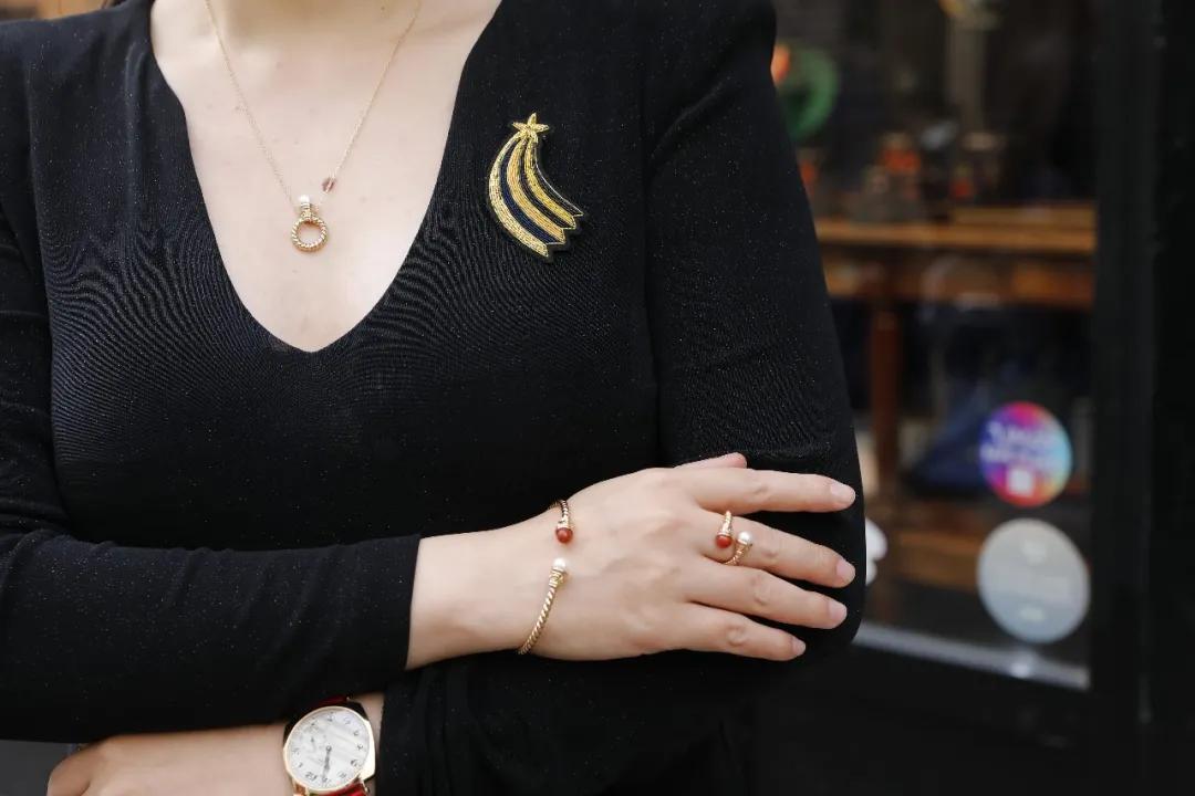 範主選了一枚天然珍珠款,和金色搭配更加低調內斂。和同系列的手鐲、戒指也是絕配。
