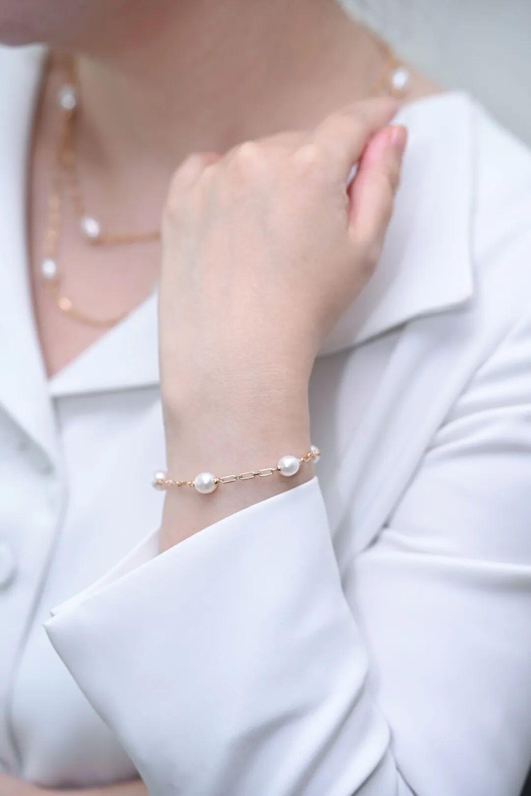 材質上同樣使用了強光的巴洛克無暇珍珠,在光線下有種波光粼粼的質感。20cm的全長可調節,對不同粗細的手腕都非常友好。它最大的設計亮點在於末端垂下的那顆巴洛克珍珠,隨着你舉手投足而輕輕搖曳,那種生動的靈氣特別迷人。