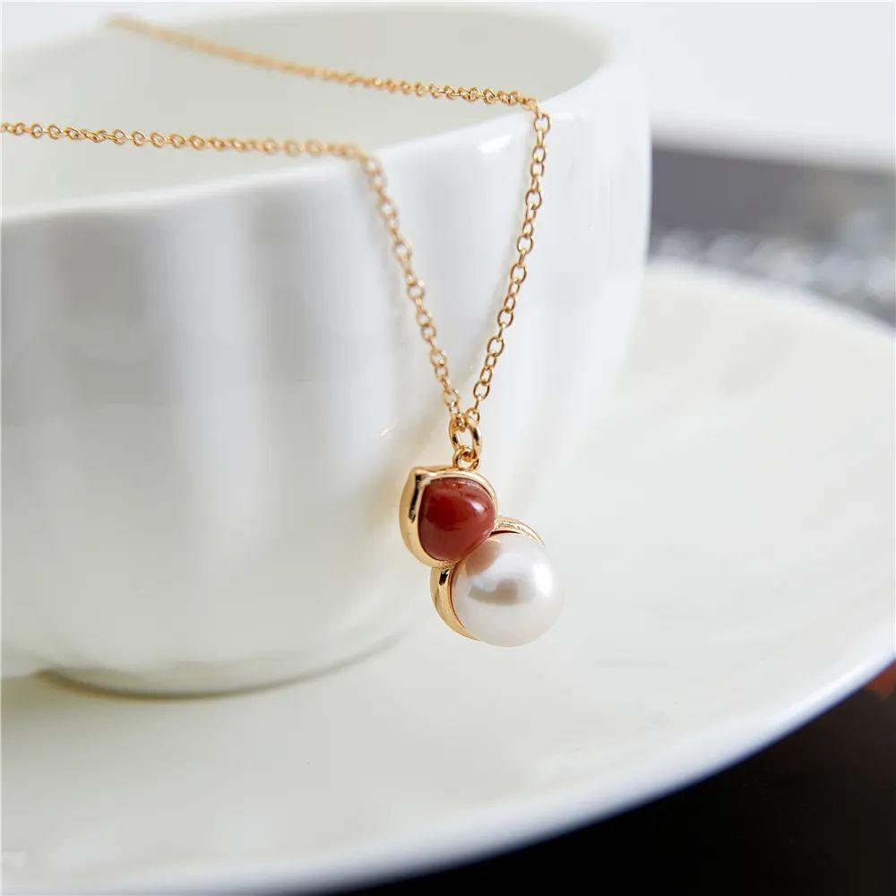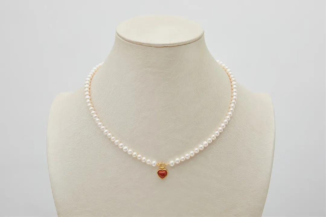 這是一款4-5mm的baby珍珠項鍊,在排列緊密有序的珍珠上,加入濃郁的點睛小桃心,南紅的質地細膩溫潤,更有着奪目的光澤,深紅色中融入了柿子紅的濃郁。