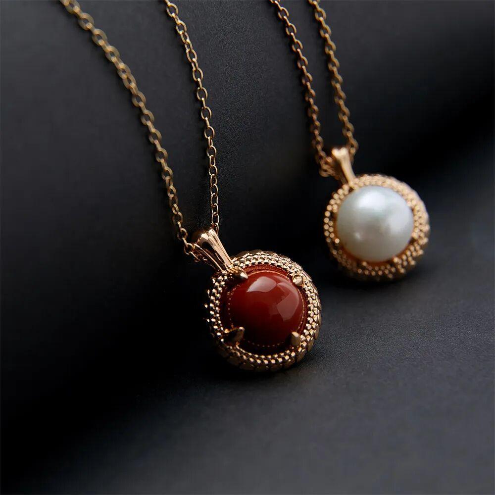 特別的是,這款項鍊還採用了雙面鑲嵌的方式,一面是10mm飽滿的大顆扁圓珍珠,另一面可以選擇不同寶石,如天然南紅、孔雀石或黑瑪瑙。