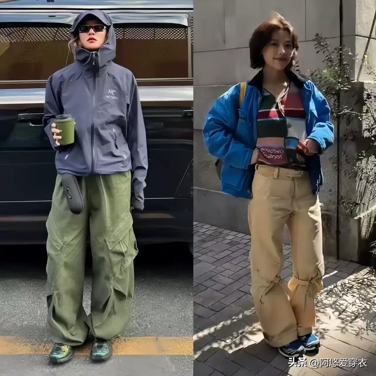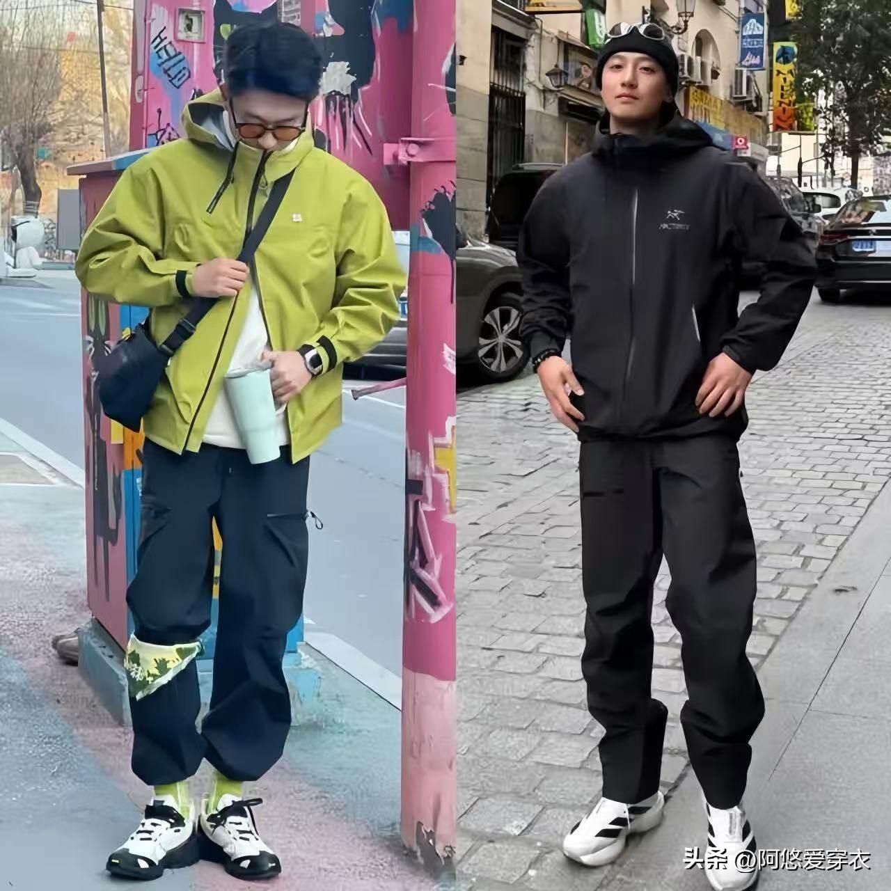 當然,衝鋒衣和衝鋒褲的版型都是寬鬆的,要是害怕顯矮顯胖,我們可以嘗試上短下長的搭配技巧,下半身最好選高腰款的褲子,着重把腰線凸顯出來,也能穿出好比例。