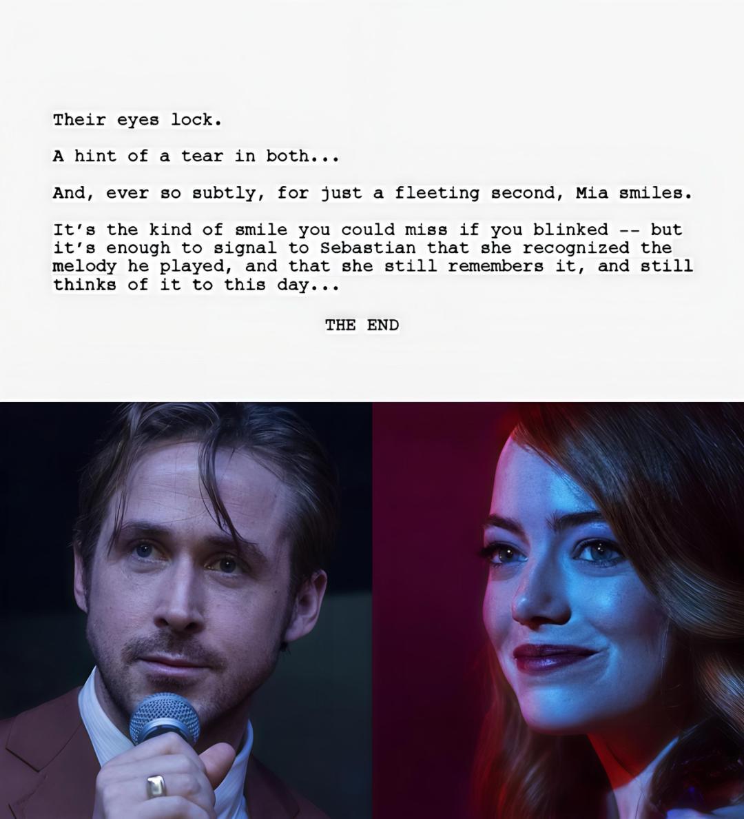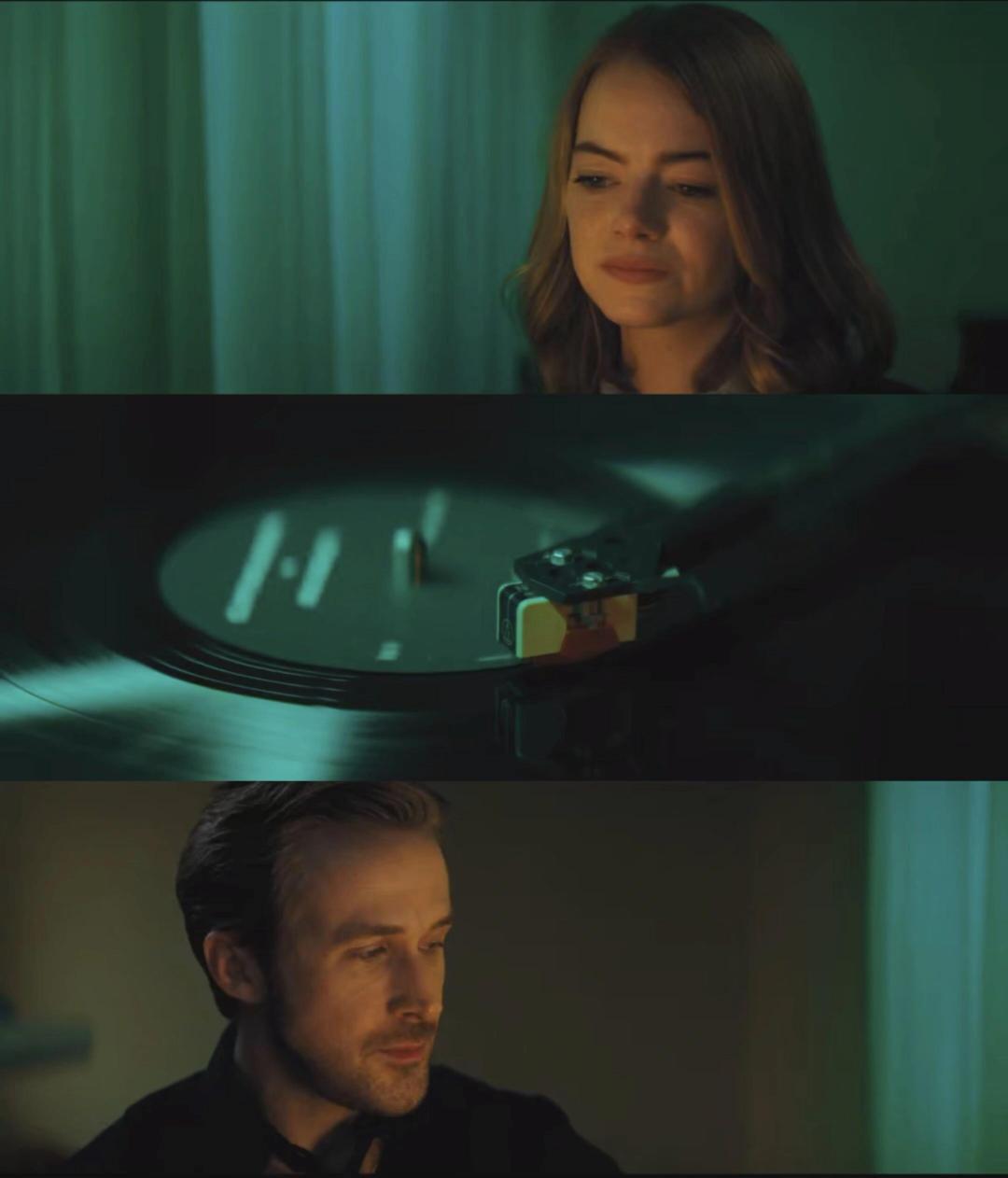 當米婭的黃裙子在洛杉磯的藍調時刻裏一圈一圈地轉,黃昏把塞巴斯汀的白襯衫染上曖昧的顏色;當兩人在家裏彈唱那首《繁星之城》(City of Stars),聲音隨着鋼琴鍵按下的節奏跳躍,宛如愛情的心跳與顫動;當米婭最後一次試鏡,講述姑媽跳進塞納河的故事,語氣平靜的獨白裏寫滿了理想的曲折;當已經成名的米婭與丈夫走進塞巴斯汀的爵士酒吧,在熟悉的旋律中,兩人短暫對視的那一刻......