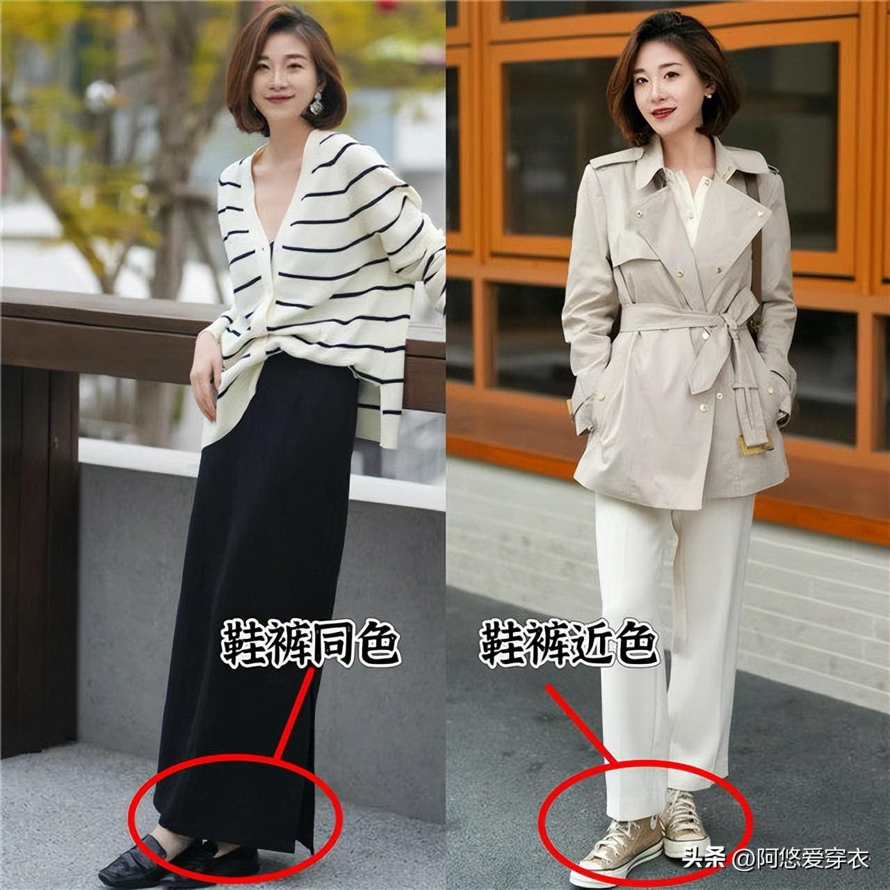 順便說一下,爲了避免鞋子和褲子的搭配產生違和感,大家還可以借鑑同色系的搭配思路,鞋子和褲子選擇同樣的色系,能增加單品的關聯度,延長我們下半身的比例,顯高顯瘦。