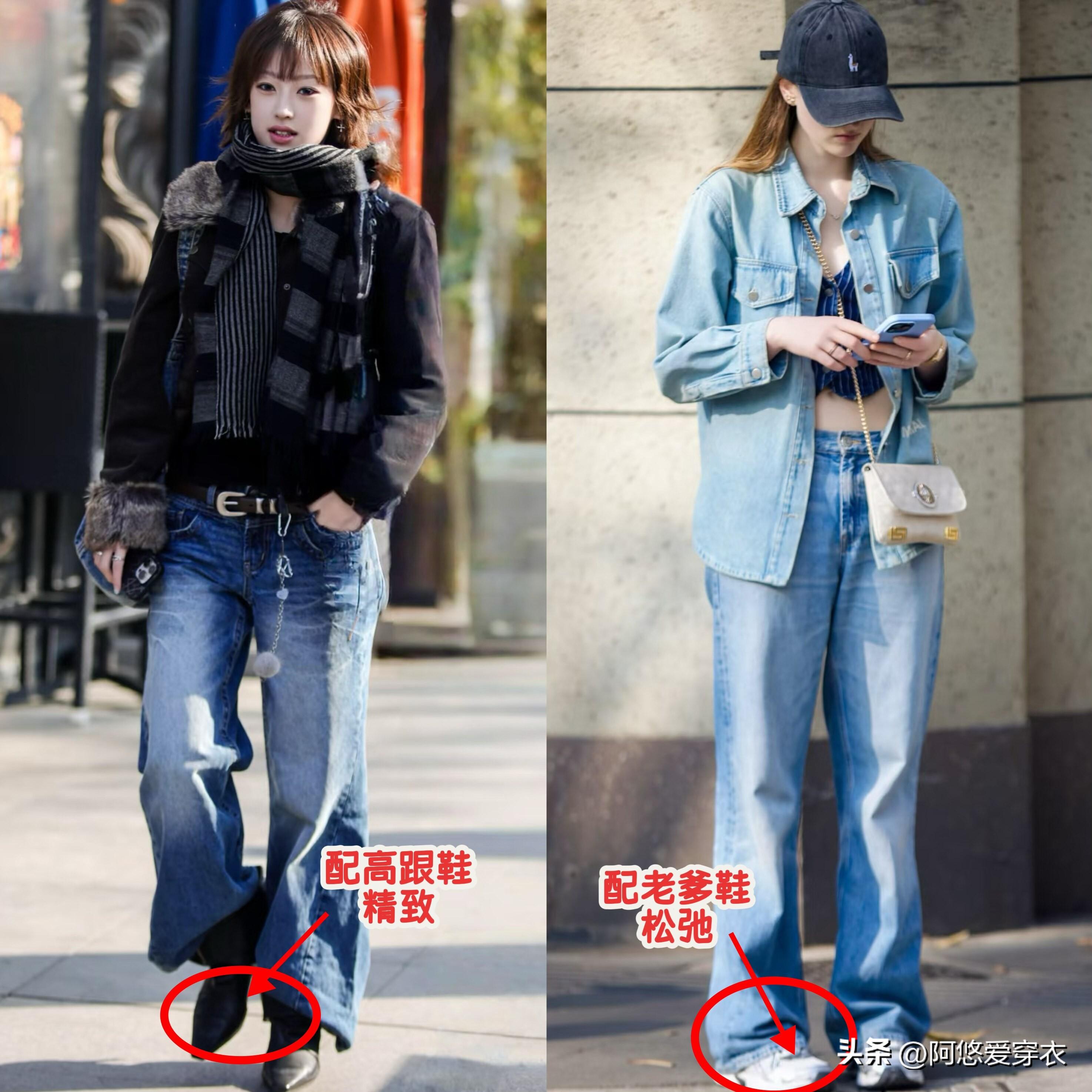 其實在街頭大家穿的褲子設計都差不多,要是想要穿出不一樣的感覺,關鍵就看你搭配的鞋子,在不同的場合中得選擇合適的鞋履搭配纔不突兀,比如休閒場合穿闊腿牛仔褲,搭配運動鞋纔對味,但若是約會或者通勤穿牛仔闊腿褲,腳下就得搭配高跟鞋,中和褲子的休閒感,增加精緻度。
