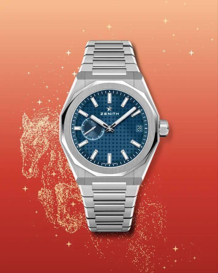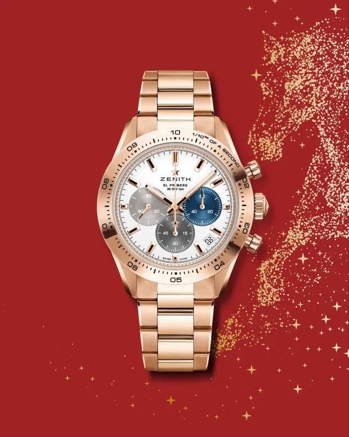 真力時今年也臻選一系列馬年時計。CHRONOMASTER旗艦系列運動腕錶,玫瑰金材質搭配純白啞光表盤+藍灰小錶盤,溫潤而富有質感,像極了冬日暖陽。