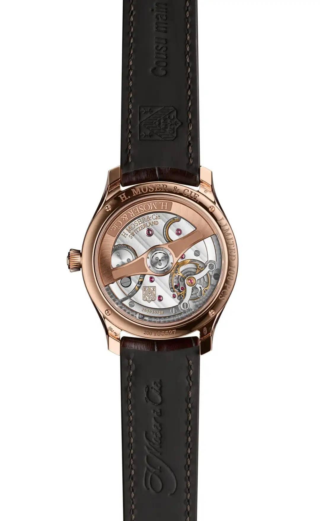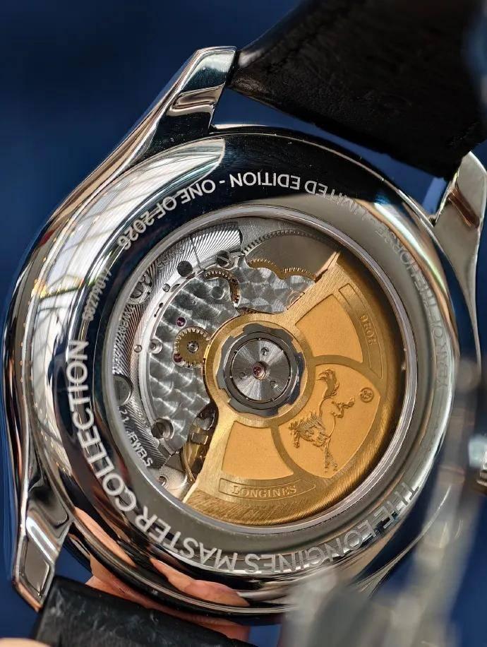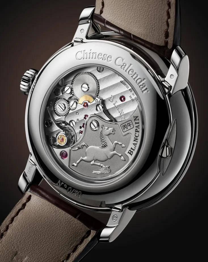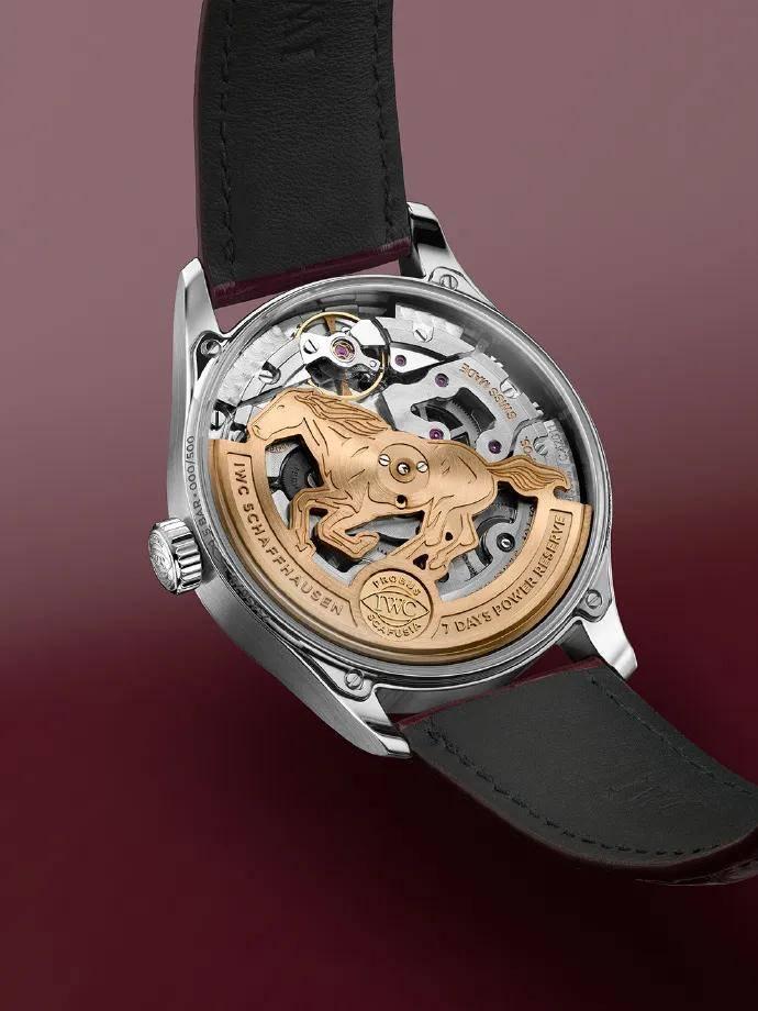 翻過背面,透過藍寶石底蓋,可以看到金色的擺陀被做成了奔馬形狀,寓意動力源源不斷,限量500枚。