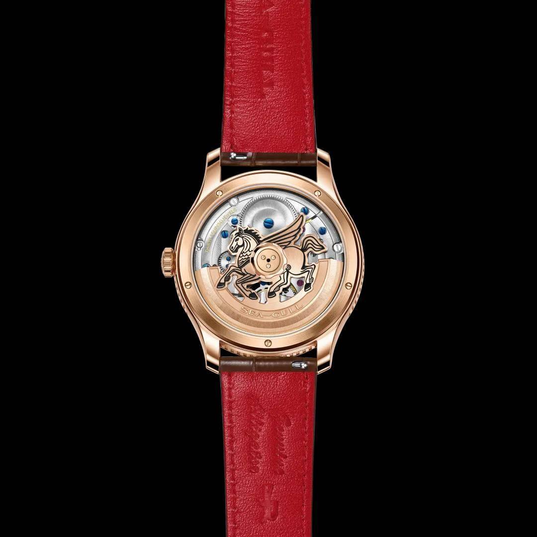 驚喜完全藏在表背,透過藍寶石底蓋,可以看到一枚玫瑰金色翼馬在機芯擺陀上馳騁。機芯則搭載ST8610,厚度僅4.3毫米,在輕薄與性能間達到了平衡。