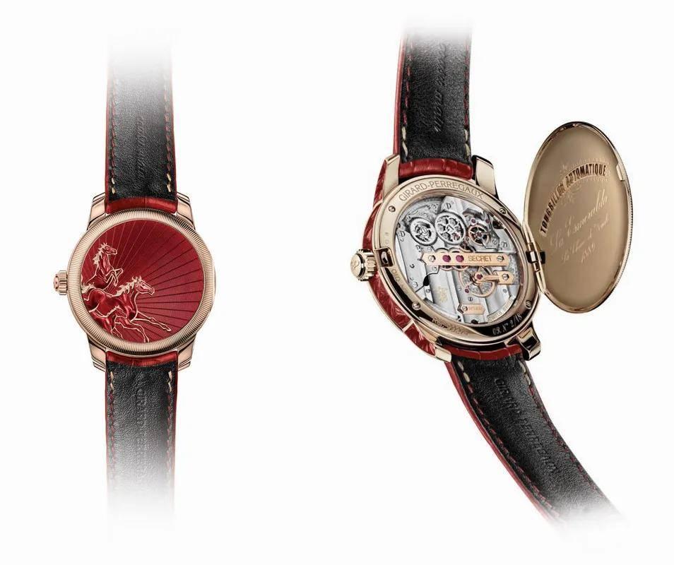 駿馬元素同樣延伸到了表背,底蓋刻有兩匹馳騁的駿馬,輕按錶冠打開神祕底蓋,可以欣賞到精緻複雜的GP09600自動上鍊機芯,象徵着金橋賀歲、馬到成功~
