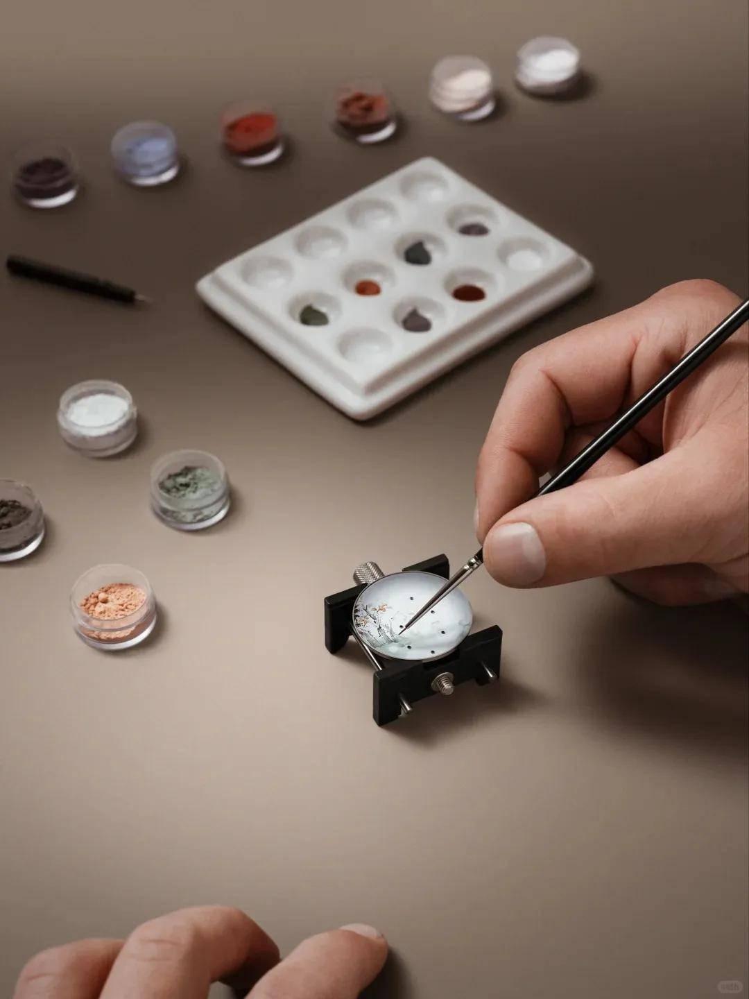 在僅2釐米見方的表背上,大師們結合微繪琺琅、大明火琺琅和璣鏤雕花工藝,完美還原了水墨畫的神韻。每一款都像是一幅隨身攜帶的名畫,文化底蘊拉滿。