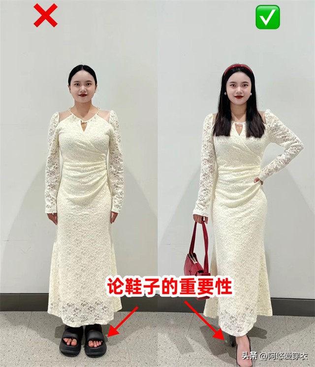 所以咱們在搭配的時候要關注每個細節,尤其是鞋子,和穿搭的風格要呼應,穿裙子的時候別踩拖鞋,換成高跟鞋不但能形成風格的呼應,還有利於增高顯瘦、優化體態。