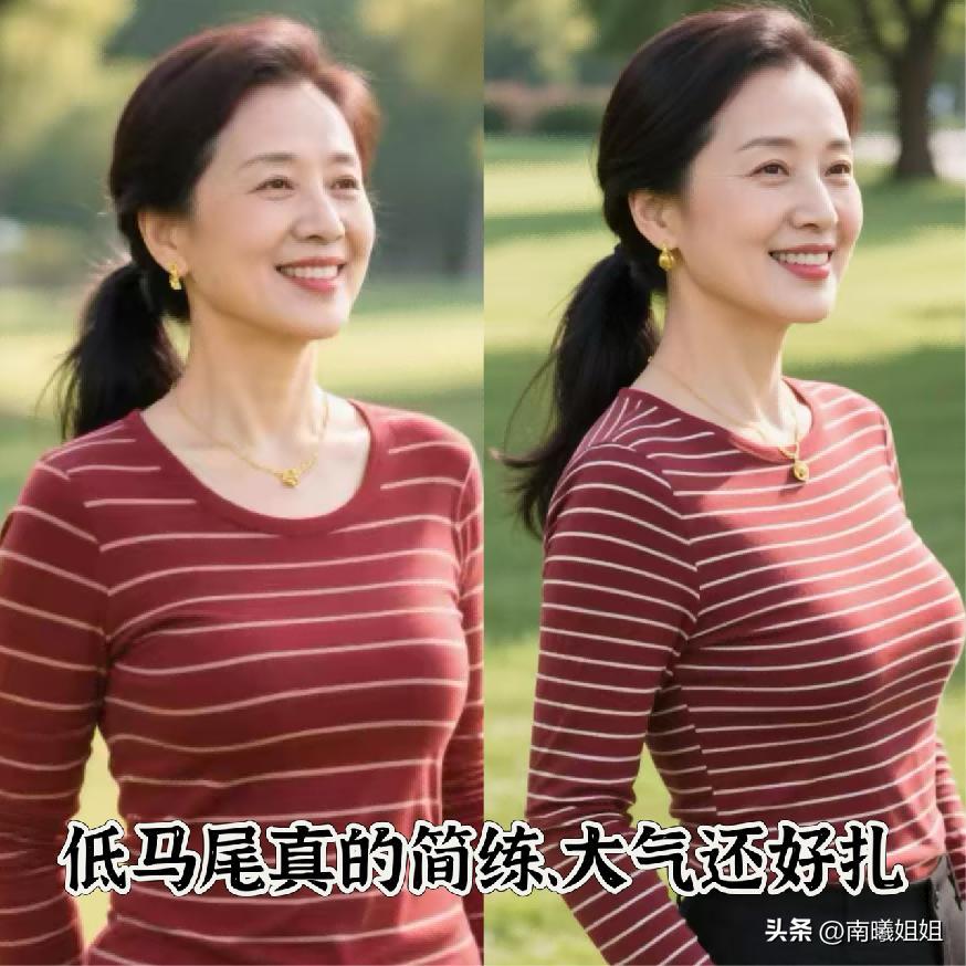 而且其實對於上了年紀的女性來說,低馬尾的扎發位置一定不是最低的,就是頭部後部的位置,不然給人的感覺會容易有一些沒有精神,建議大家可以稍微提高一點,與我們的耳垂部位是屬於齊位的狀態,不僅能夠很好的優化我們整個頭型的輪廓,而且也要比極低的低馬尾扎發展現好的精神氣!