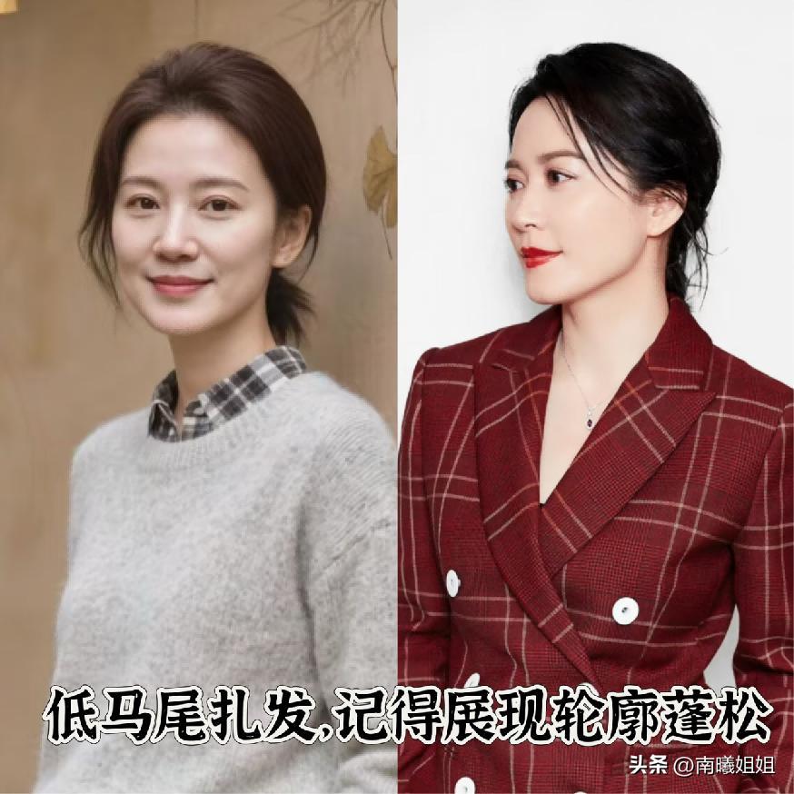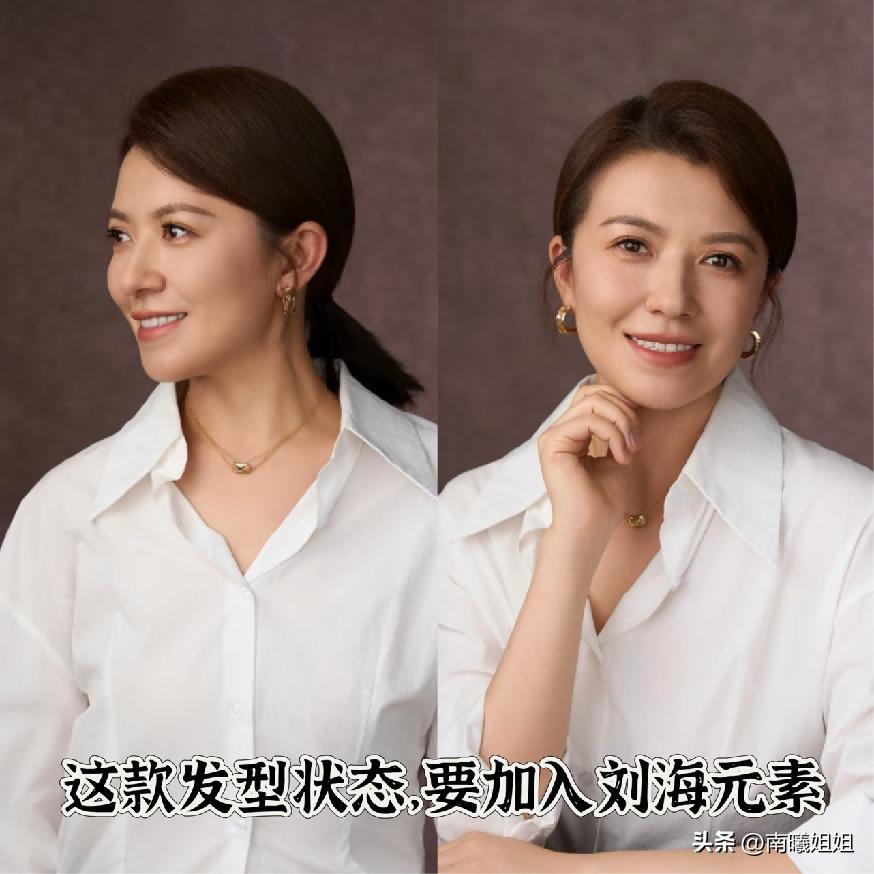 像如果是運用低馬尾的髮型狀態,其實就比較適合加入一些劉海的元素,用來修飾我們的臉型了,例如像兩側劉海或者是側分的斜劉海,其實對於當下這個年齡階段的女性而言,都是10分具有優勢的也比較具有穩定性。