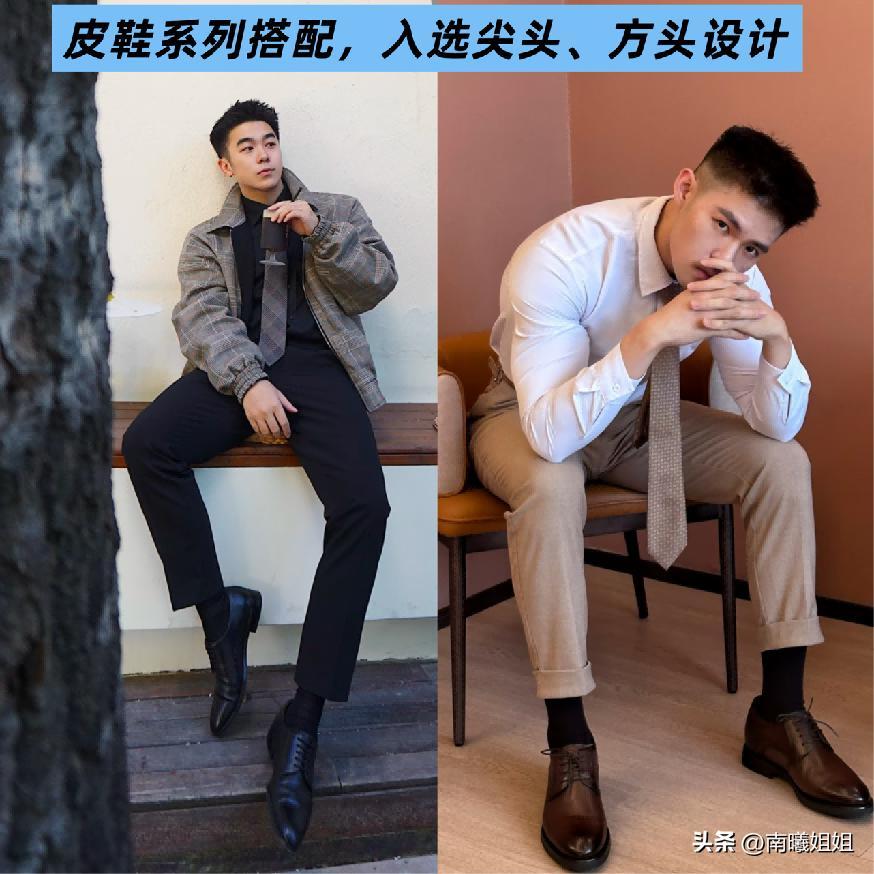 像皮鞋這樣的版型狀態,就建議大家可以首選搭配具有高級和利落感的尖頭或者方頭這樣的設計,展現出來的整體穩定性以及視覺上的利落高級感還是比較明顯的。而且對於很多正式場合當中的穿搭而言,尖頭或者方頭的版型狀態會比傳統的圓鞋更加體現男性的沉穩和氣場。