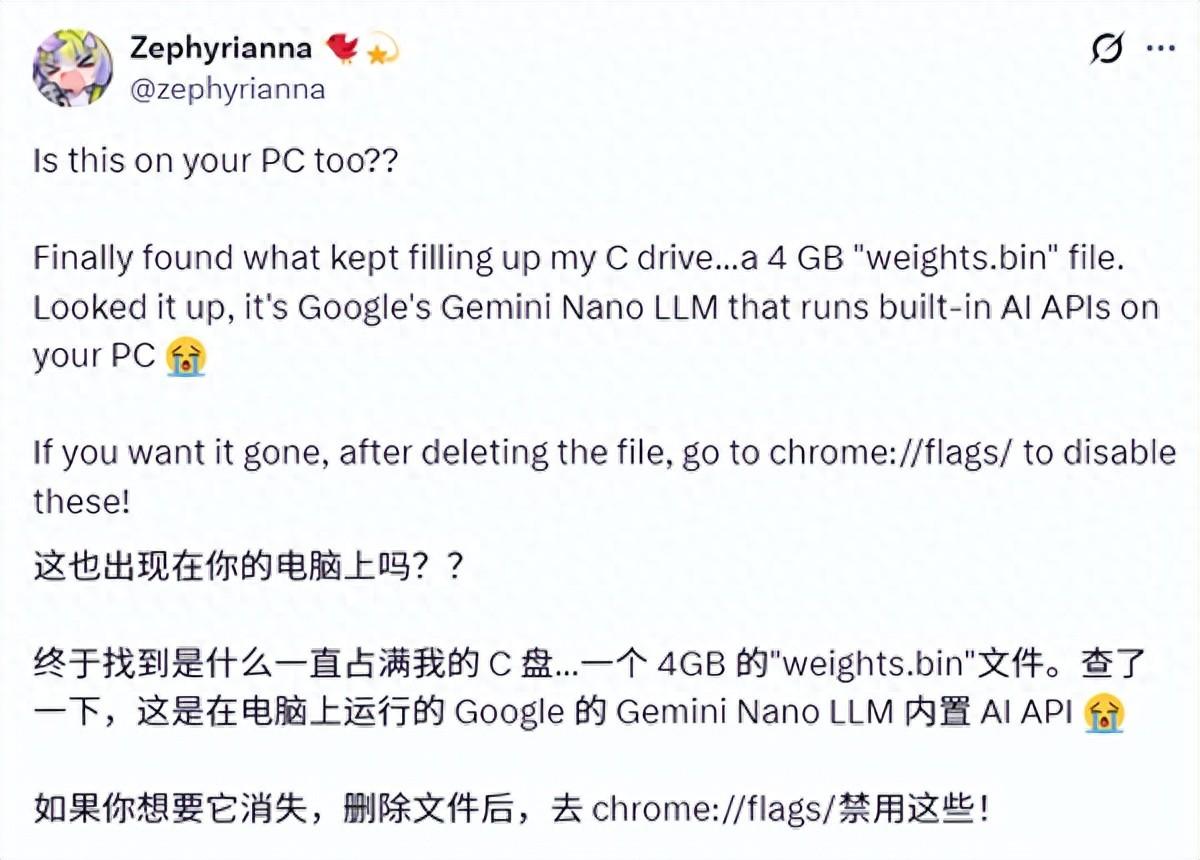 經分析確認,該文件爲Gemini Nano AI模型,用於支持瀏覽器內置AI功能,整個過程未經用戶同意。