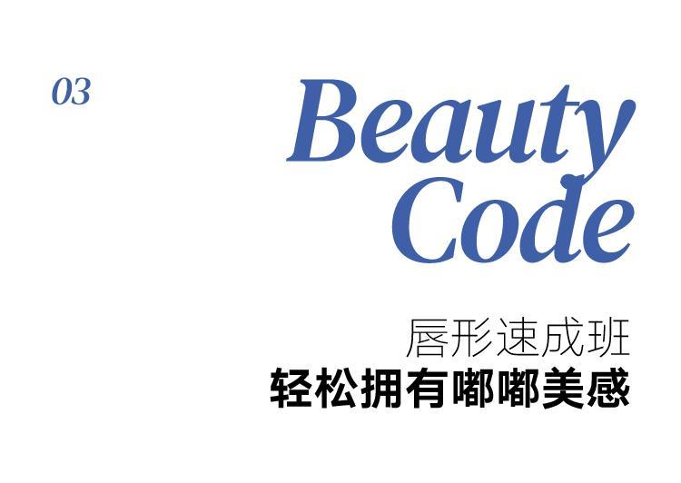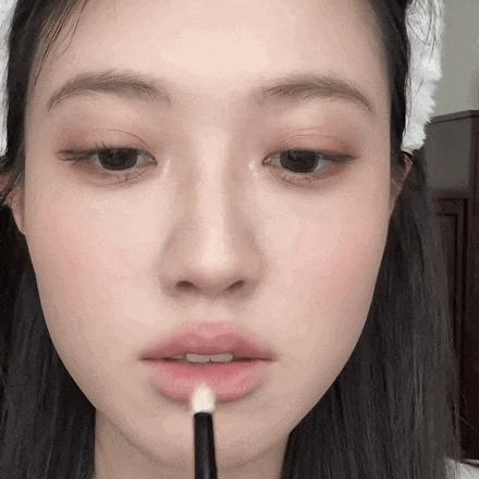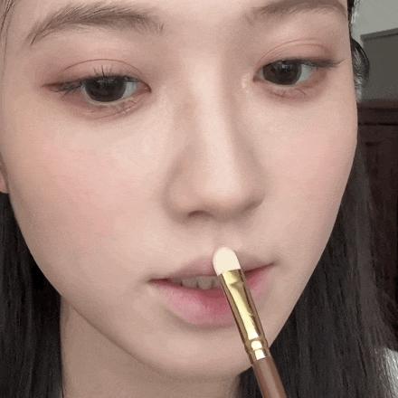 這一步主要是用柔和的粉狀產品打造出脣色自然漫開的感覺,能夠在模糊脣線的同時,進一步遮蓋脣周暗沉,爲後續飽滿脣中的水光色做準備。