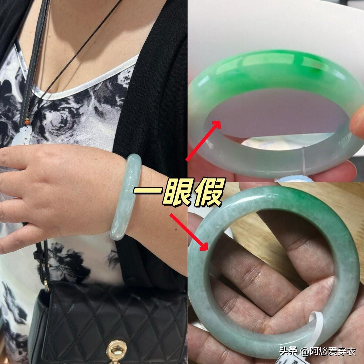上年紀的女人特喜歡戴翡翠,但有不少人覺得翡翠貴,就先買個便宜的湊合戴,去地攤上買個幾十、一兩百的 “翡翠”戒指或者手鐲,自以爲別人看不出來,但這些假翡翠品質真的很差,大多是酸洗注膠、染色處理的B貨C貨,根本就沒有天然翡翠的溫潤光澤感,懂行的人一眼看過去就知道是假的。