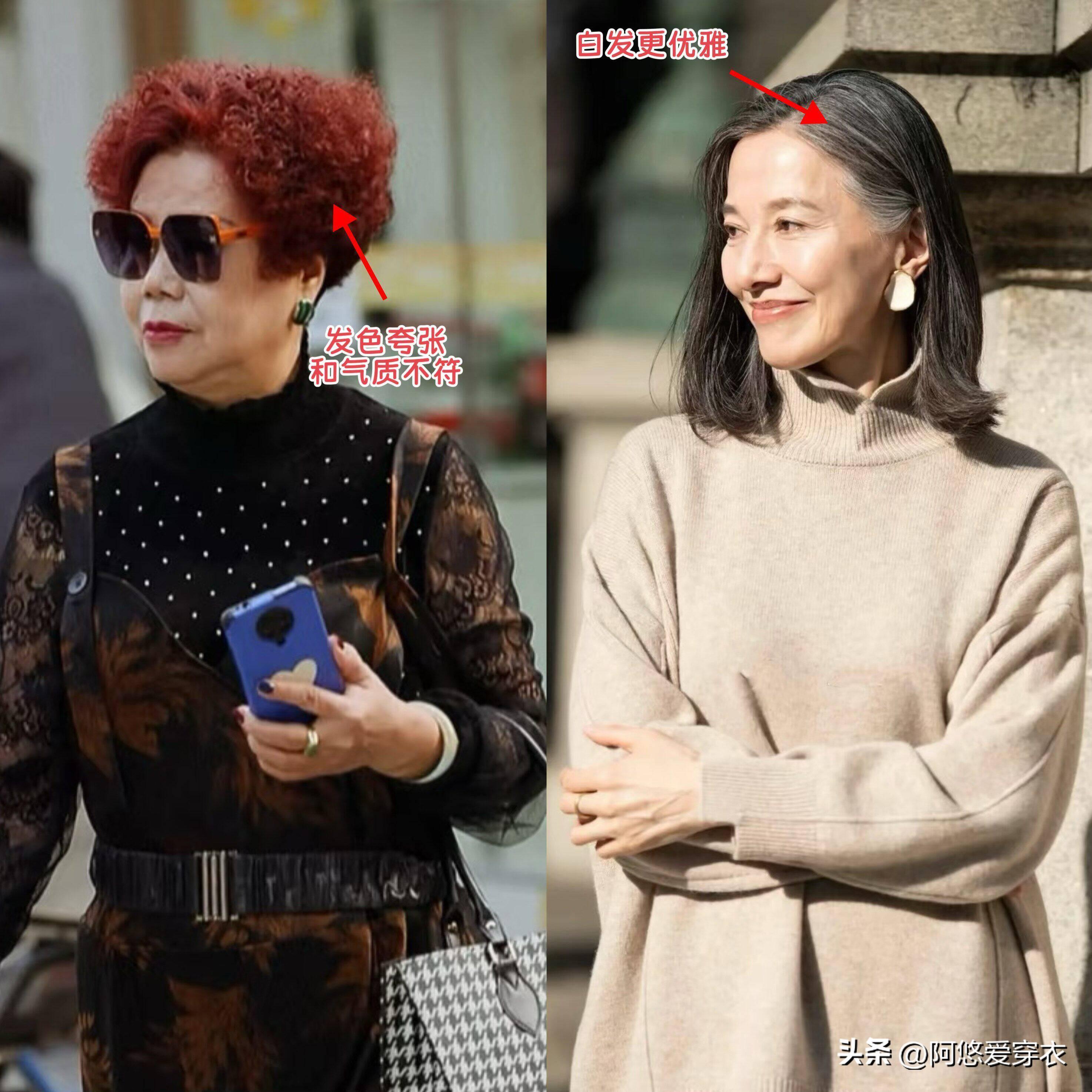 其實白髮真的沒大家想象的那麼顯老,咱們來看下面的對比,當上年紀的奶奶頂着一頭誇張的紅髮,真的看不出絲毫的美感,反倒是給人一種誇張豔俗的感覺,而保留原生白髮的奶奶,則散發出了滿滿的優雅感。比起染髮,白髮的優勢其實更多,既可以提亮我們的膚色,還可以轉移注意力,弱化面部的衰老感和鬆弛感。