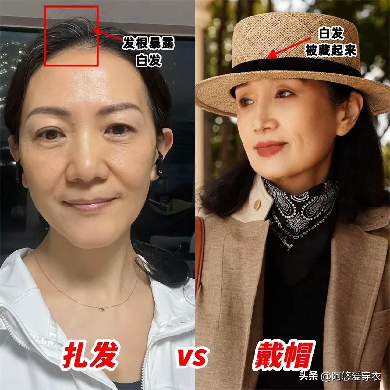 ①戴寬檐帽,遮蓋白髮還顯臉小