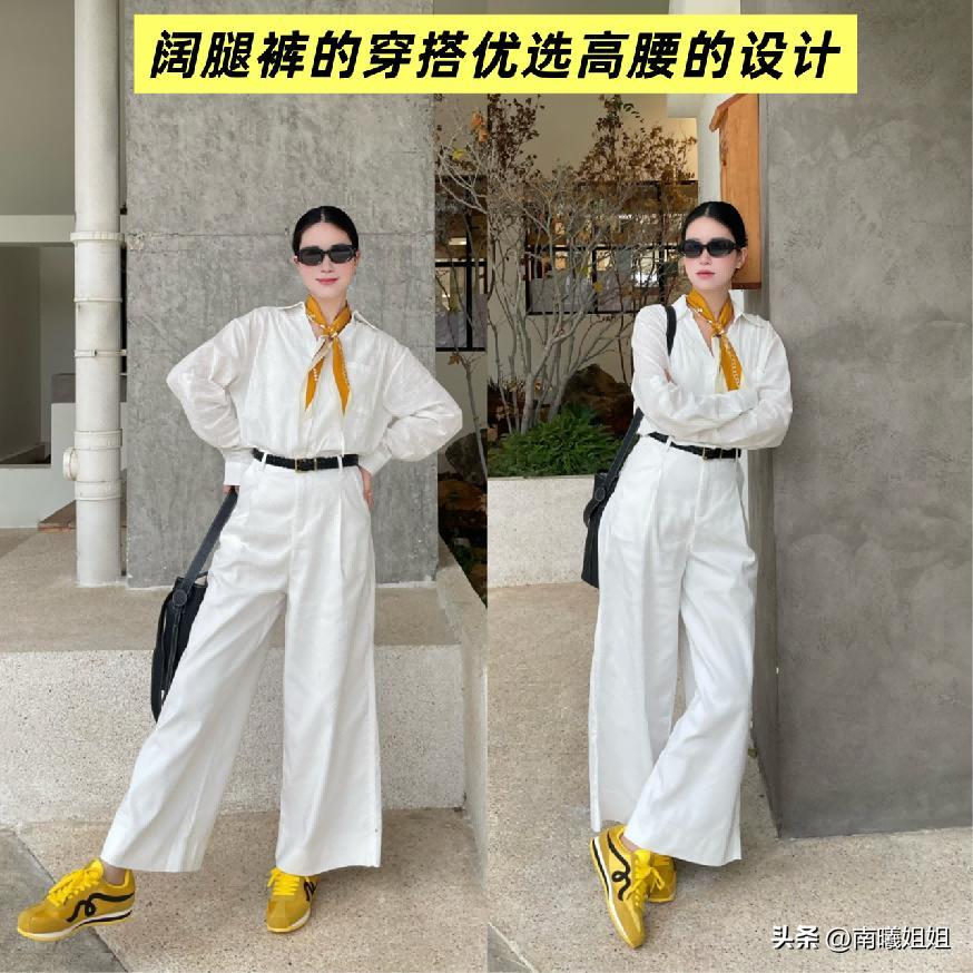 ❶ 闊腿褲可優選搭配高腰設計,體現標準比
