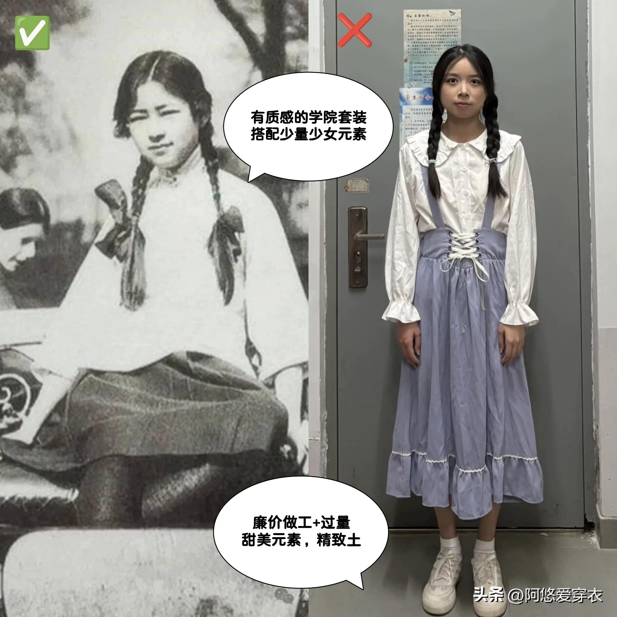 如果你也想穿出林徽因這種特別天然的少女感的話,聽我的,千萬別跟着網紅穿什麼大面積的蝴蝶結、蓬蓬裙,這些複雜的少女元素堆疊在一起,再加上皺皺巴巴的面料簡直就是災難,巨精緻土!