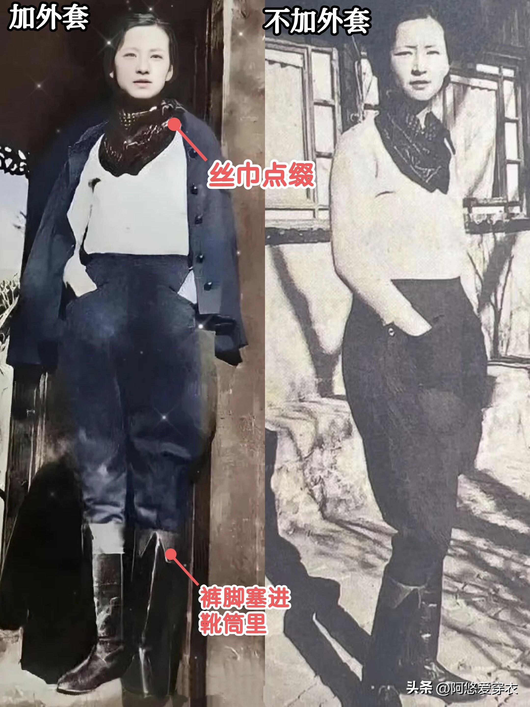 但是單穿可能就有點單調死板了,我們可以跟林徽因學學,用撞色絲巾點綴,或者把褲腳塞進長靴筒裏,也可以加件和下裝同色系的外套呼應一下,簡直美呆了!