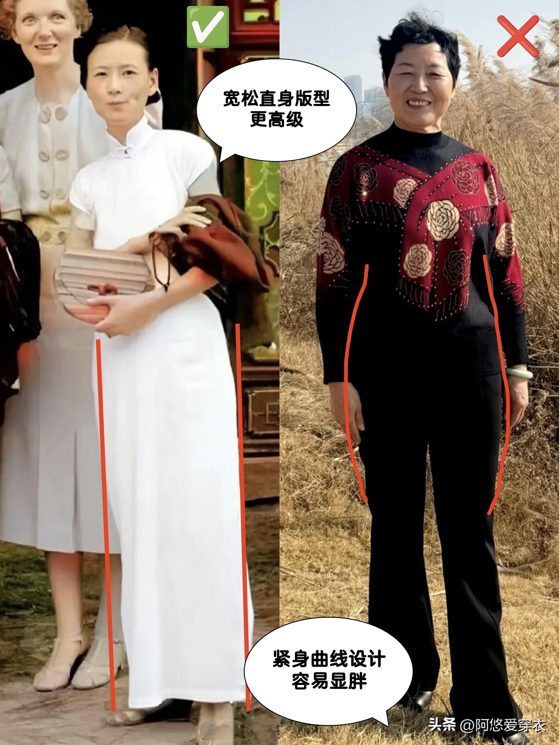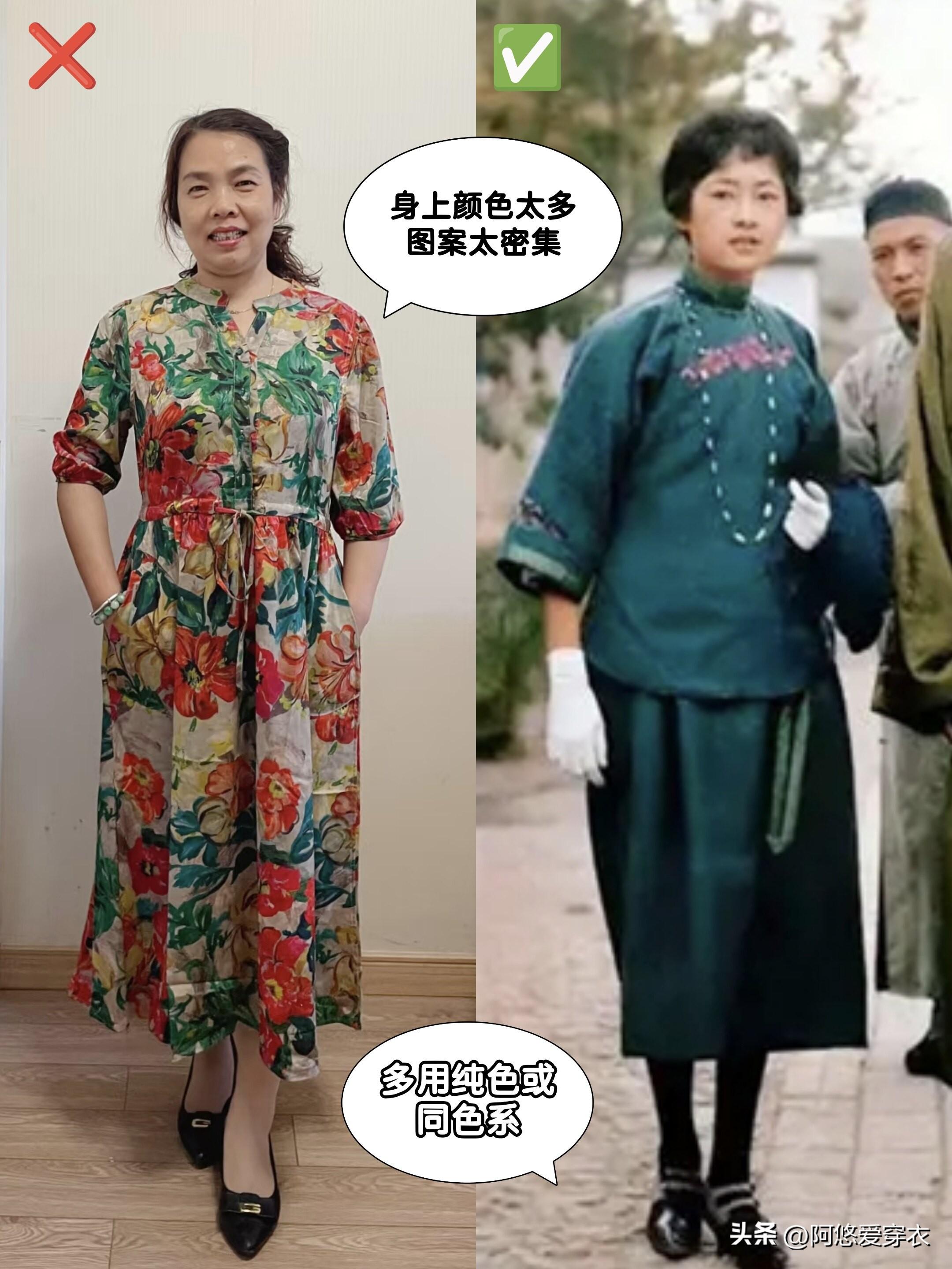 上了年紀就需要沉穩點,最好選深色或素色的,然後像林徽因一樣疊加點細項鍊、玉鐲等文化感強的配飾就不會單調啦,春夏這麼穿出去拍照包出片的!