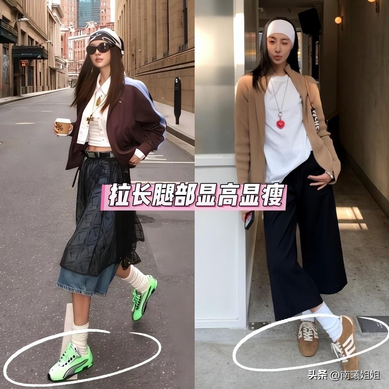 與厚底鞋直白的物理增高不同,薄底鞋的“顯高”更爲巧妙。它通過修長、流暢的鞋身線條,在視覺上延伸了腿部比例。尤其是搭配長褲時,薄底鞋能輕鬆滑入褲腳,讓腿部線條一氣呵成,營造出“胸以下全是腿”的錯覺。對於小個子女生來說,選擇與下裝同色系的薄底鞋,更是拉長身形的不二法門。