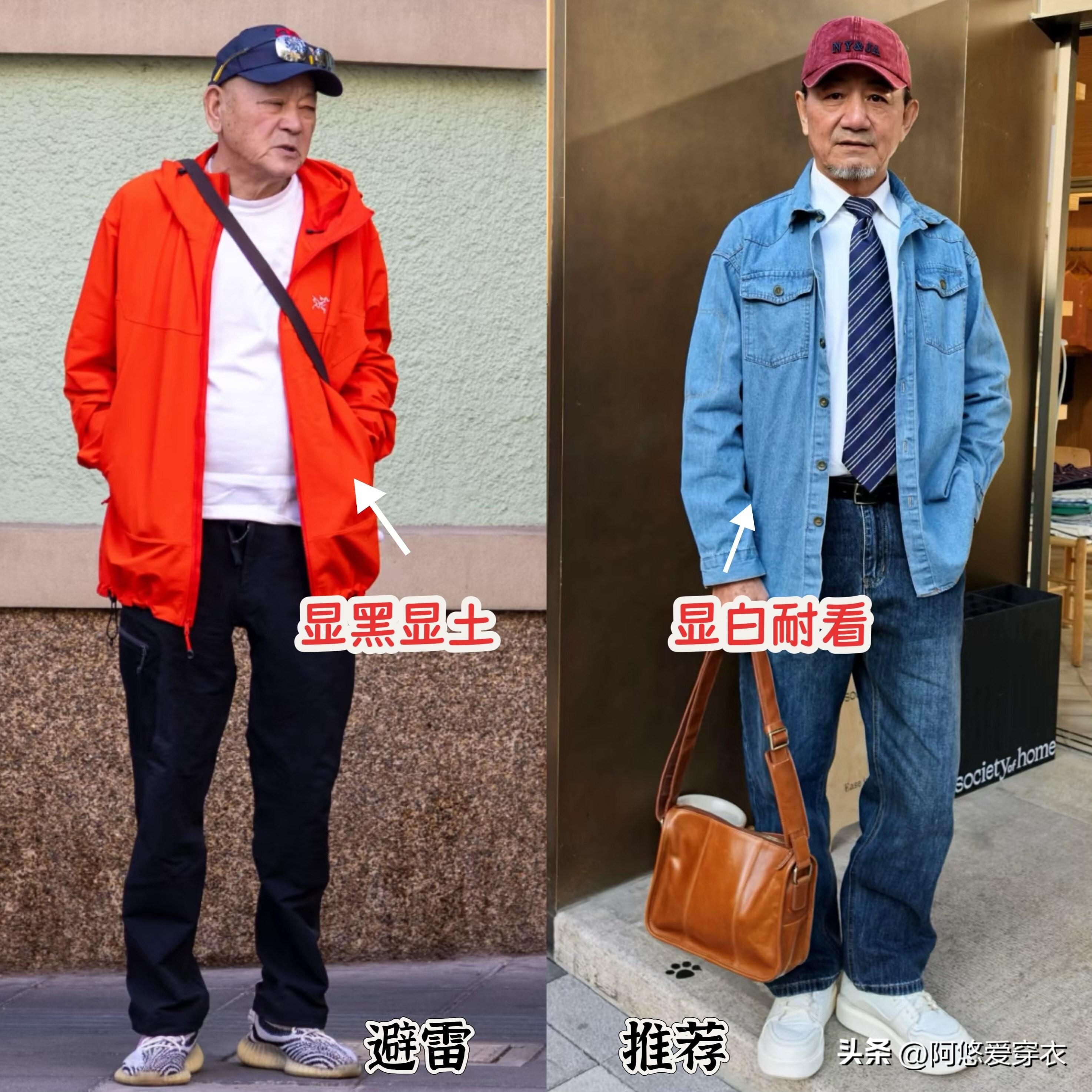 上年紀的男人少爲了裝年輕穿亮色款的衣服,尤其是飽和度高的色彩,幾乎很少有人能駕馭,像這種橘色、大紅色的衣服,年紀大了是真的很難駕馭,穿上不但不時髦,還襯得膚色更黑,土氣感拉滿。