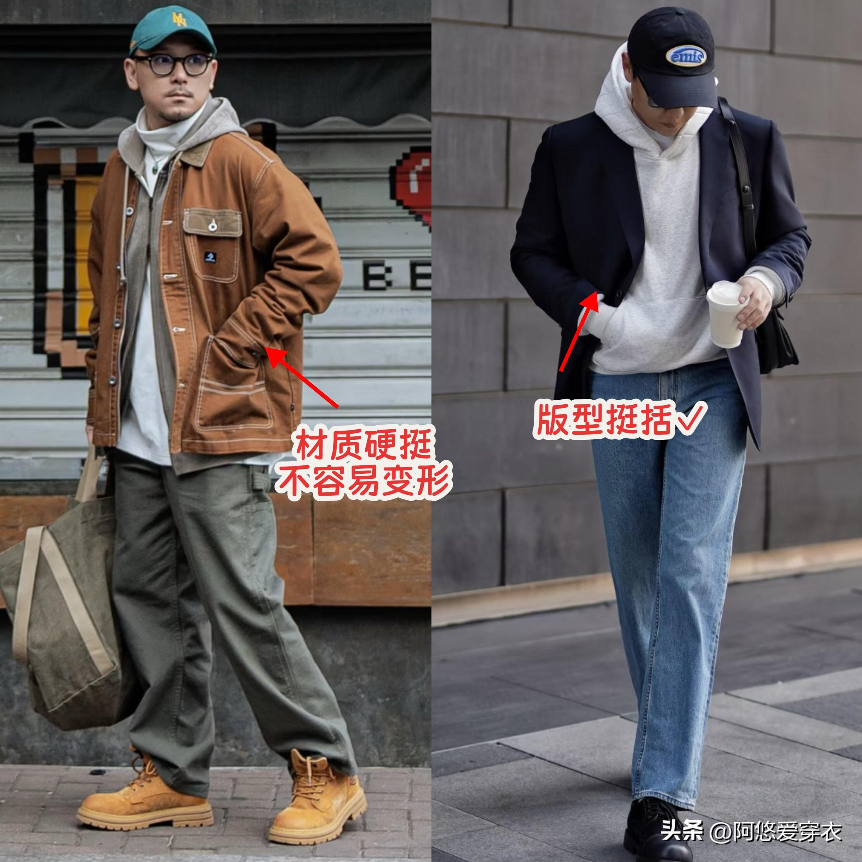 此外,在疊穿衛衣的時候也不能只是傻乎乎的將兩種簡單的單品組合起來,還得講究材質的呼應,比如穿柔軟的衛衣,外面可以疊穿一件挺括的工裝外套或者西裝外套,工裝外套的材質比較硬挺,不容易變形,適合微胖的男人,而西裝外套的版型挺括,正肩、廓形的設計也能遮住上半身的贅肉,就算是疊穿衛衣都不怕顯臃腫。