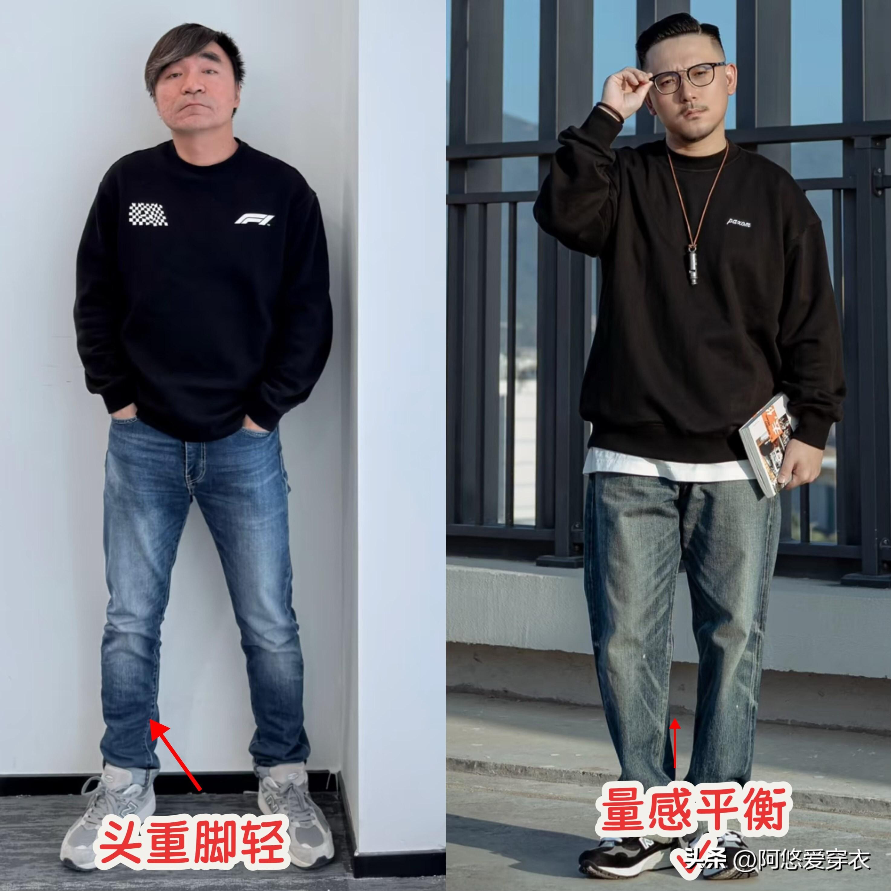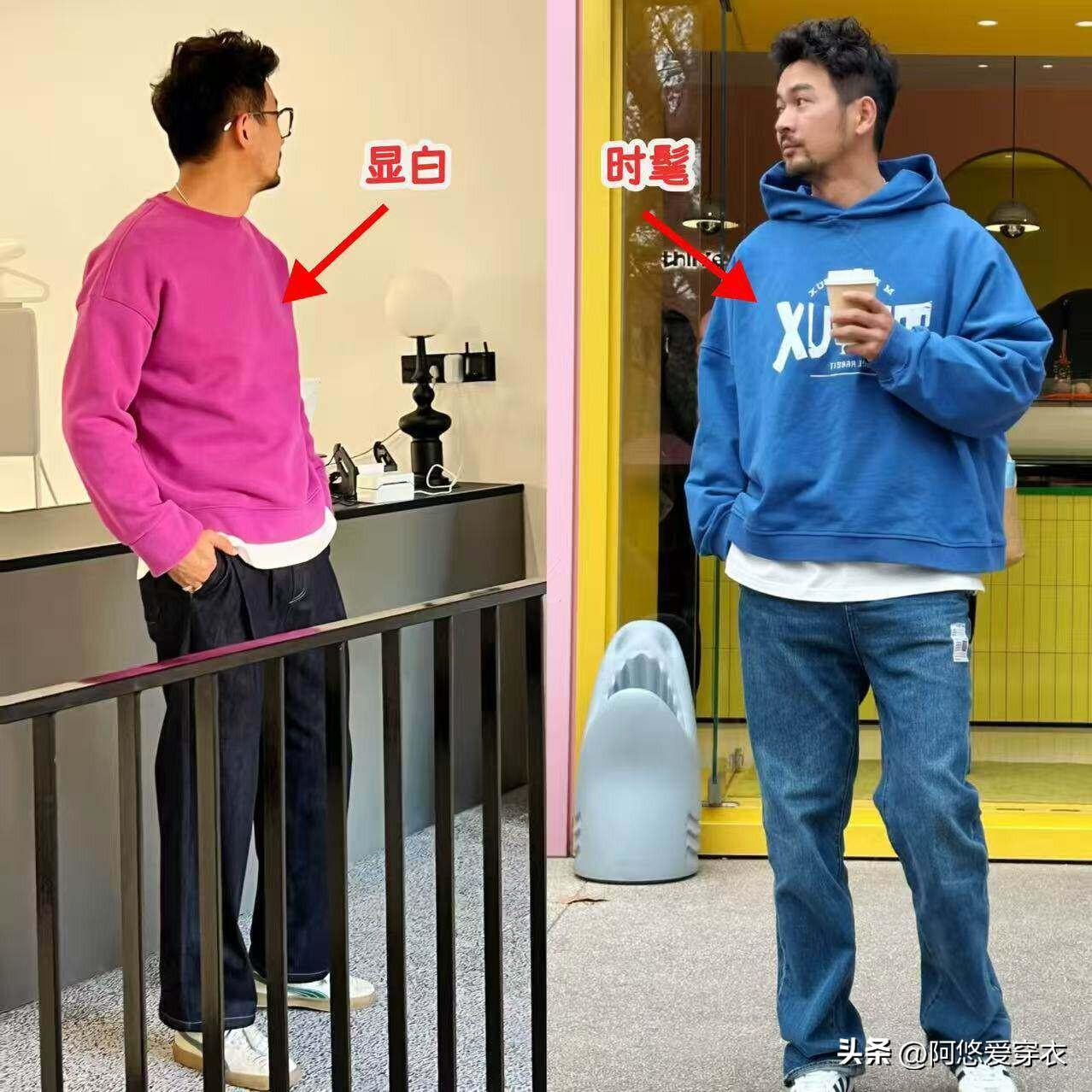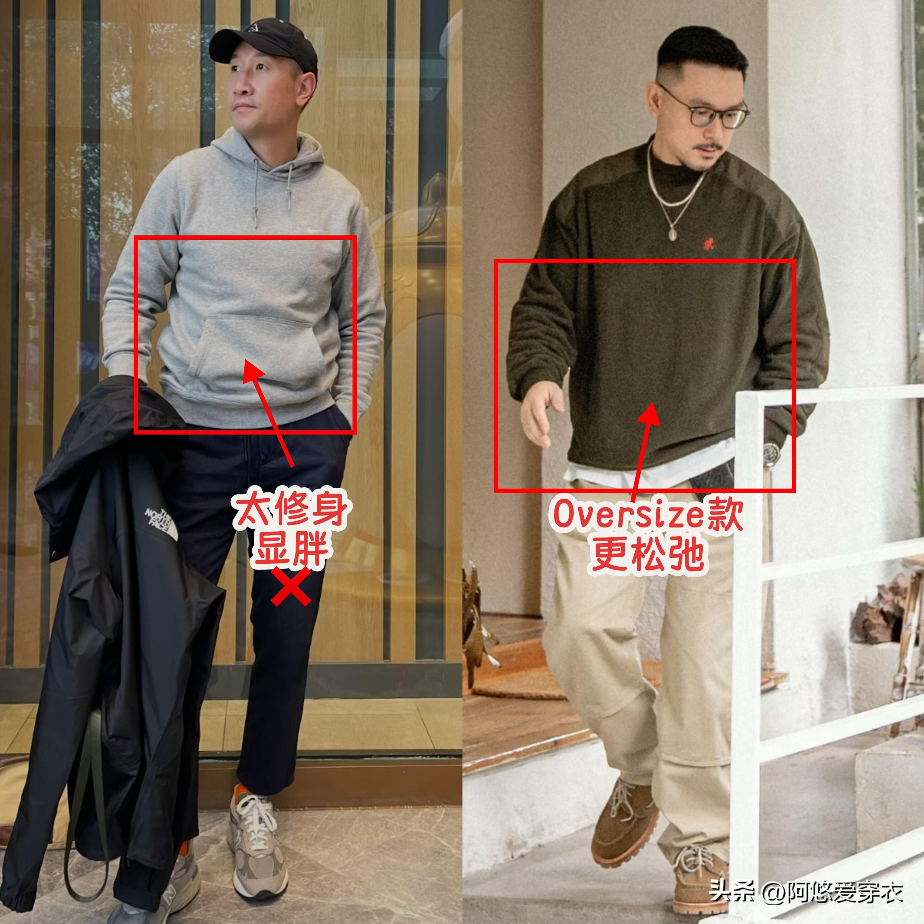 中年男人選衛衣,想要穿出時髦感,達到顯瘦的目的,那就不能選常規的修身款,這種剛好貼合我們身材的修身款衛衣最容易顯胖了,穿在身上沒什麼餘量,衣襬堆在肚子附近,還會顯得肚腩很明顯,整個人身材更臃腫。
