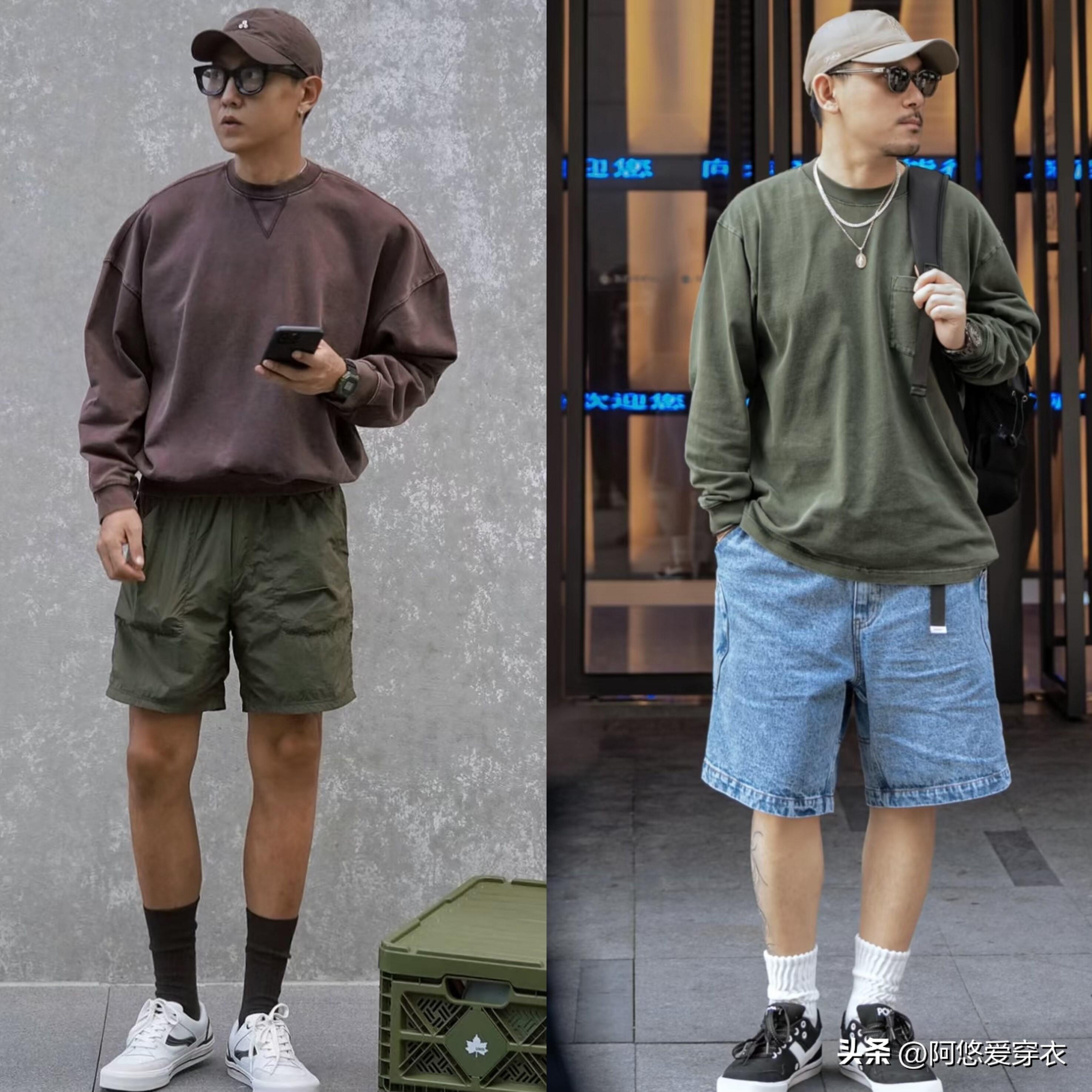穿衛衣要打造出清爽感,可以試試給腿部留白,比如這兩位大叔在穿衛衣的時候也沒有總是固守陳規搭配長褲,換成五分的短褲照樣很時髦,還可以露出小腿,降低下半身的堆積感,讓我們的整個搭配看起來鬆弛多了。再踩上一雙平底鞋,舒適度極高,日常逛街、戶外爬山都可以這麼搭配。