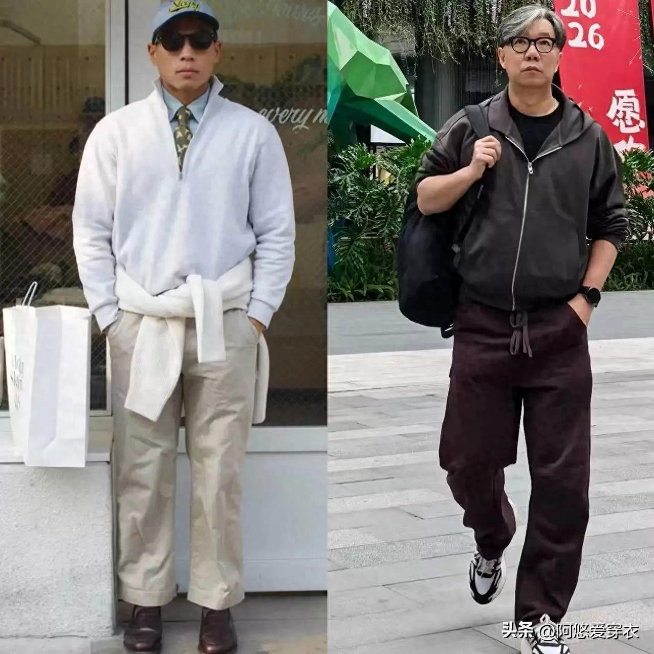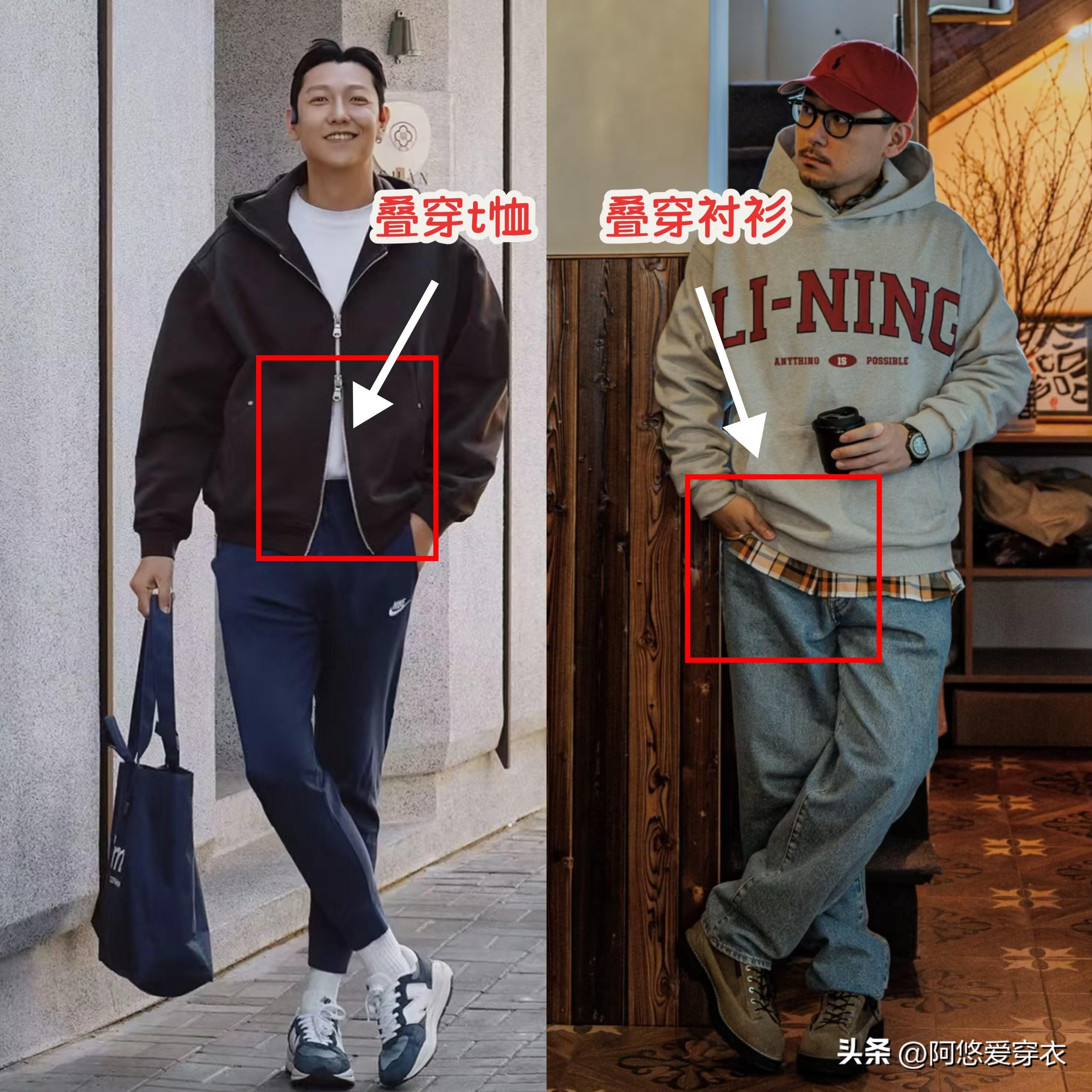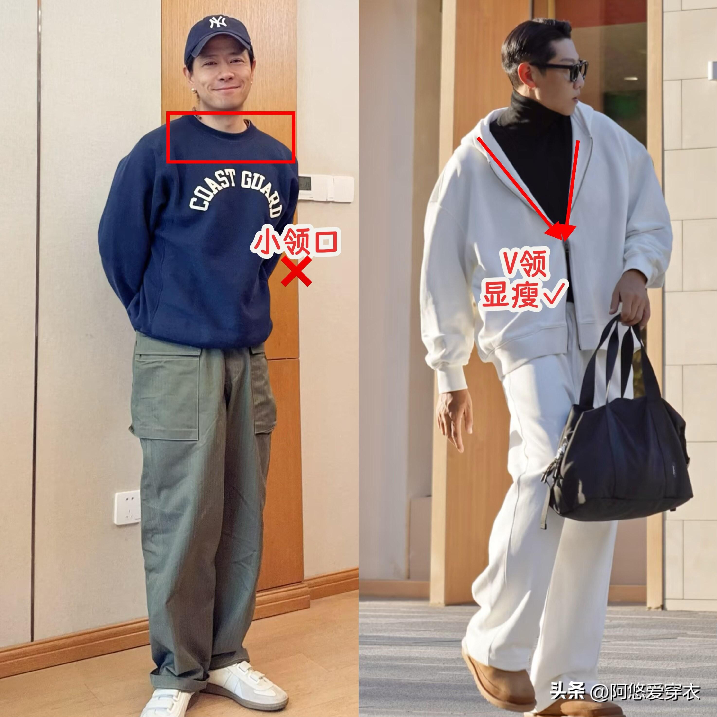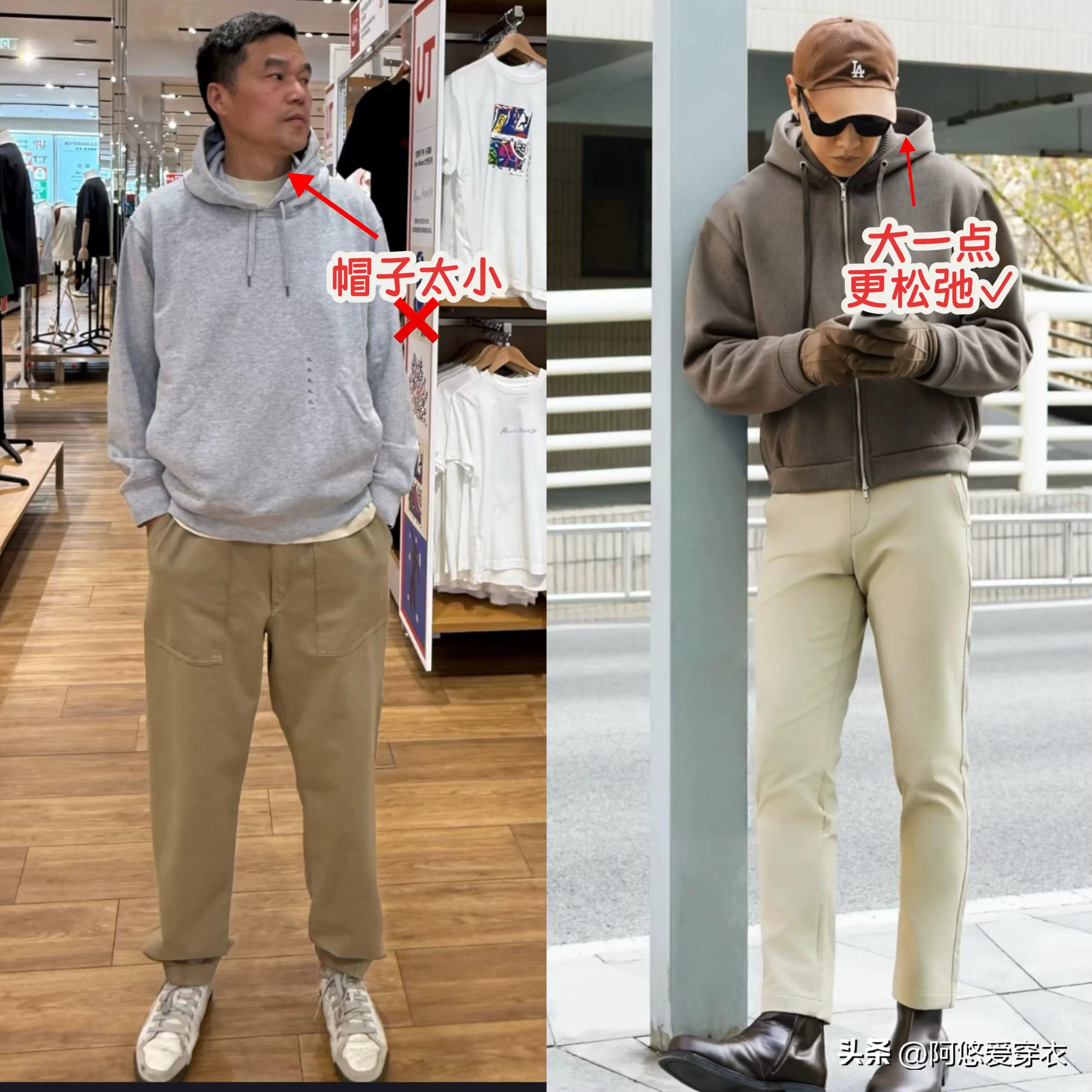 比如常規的小領口衛衣,穿着就會顯得比較單調,學這個大叔穿拉鍊式的衛衣,把拉鍊拉下去製造出v領的效果,一下子就洋氣了,還能拉長身材比例。