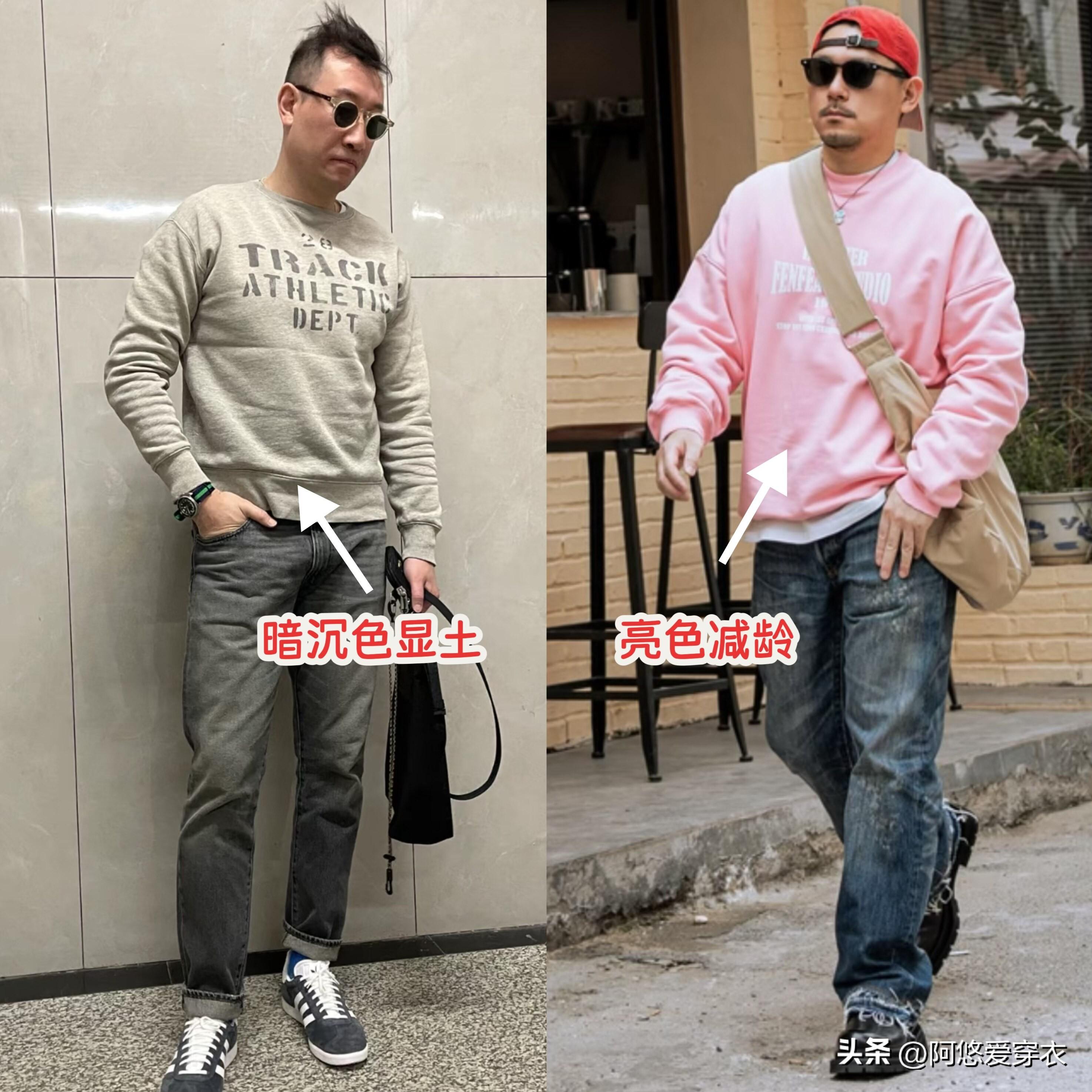 其實年紀大的男人更應該多嘗試淺色系的穿搭,選衛衣的時候也可以試試亮色款,像這位大叔穿上粉色的衛衣真的時髦了不少,明明跟左邊是同齡人,看着卻年輕十歲。