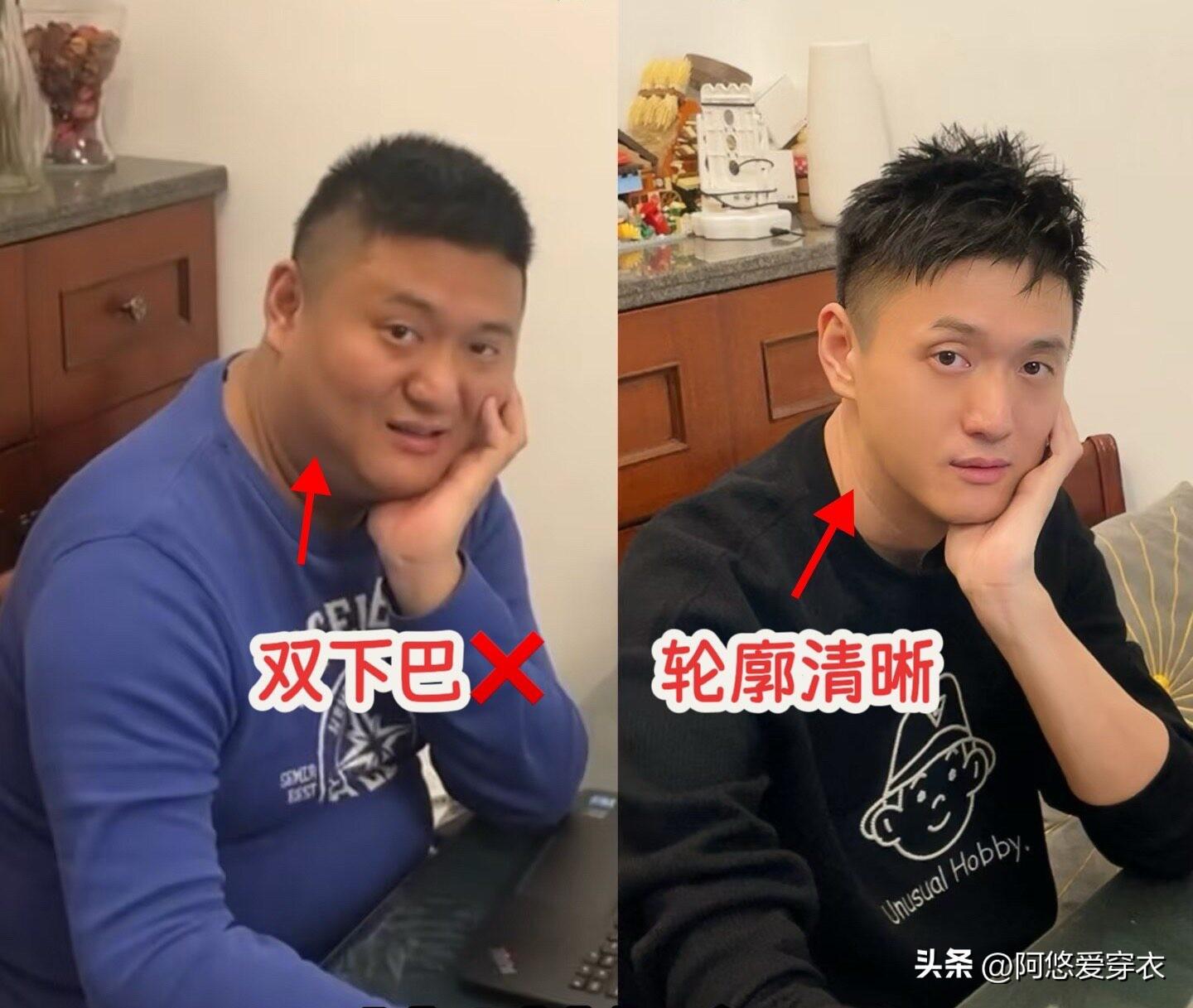 你看下面的對比,這個大叔放縱時臉上堆積了贅肉,臉大脖子粗,雙下巴更是十分地搶鏡,一整個油膩感拉滿,而自律後的他面部的脂肪消失了,五官的輪廓出來了,整個人的顏值直接提升了好幾個檔次,瞬間從油膩大叔變成了帥氣的愛豆。