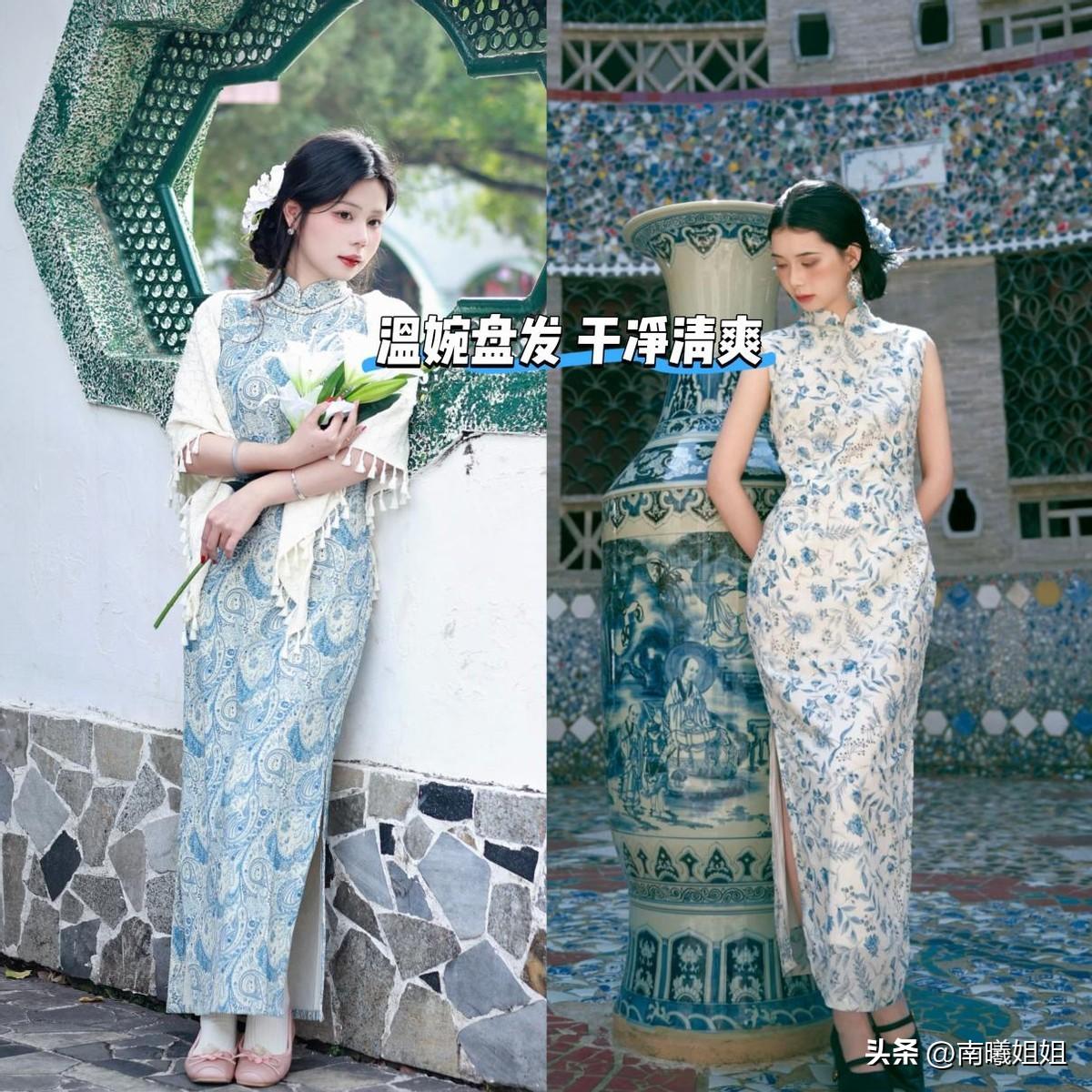 經典的青花瓷裙,多數以改良旗袍爲主,加入斜襟、盤扣、低開叉的設計,保留了中式感的款式,除此之外,還有很多現代化的裙款,例如抹胸裙、魚尾裙、無袖傘裙等等,更適合日常穿。