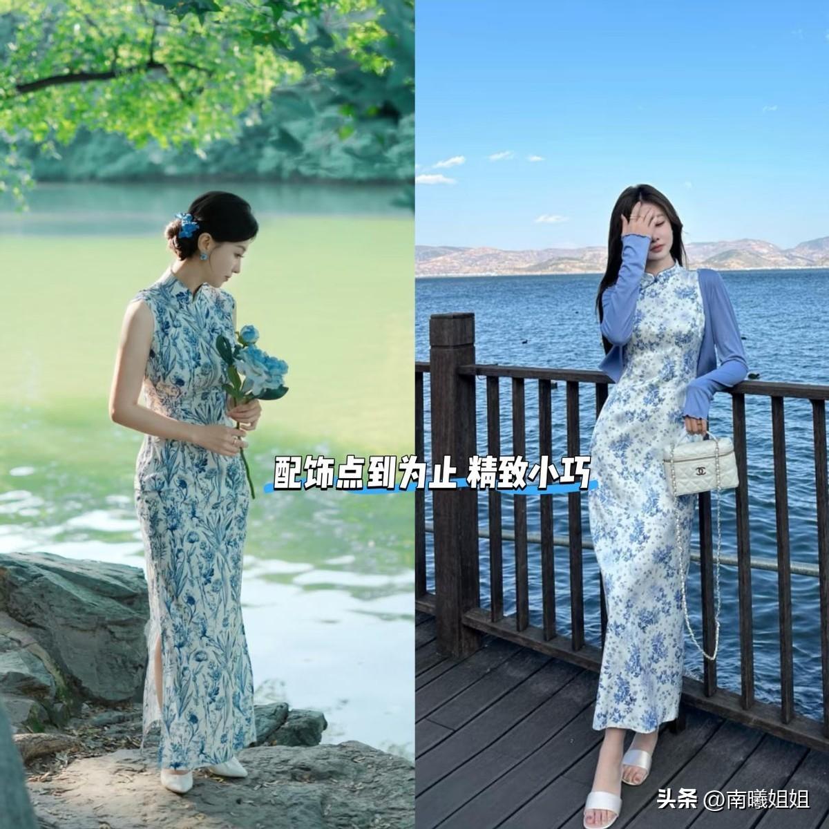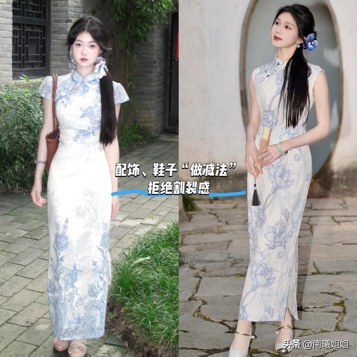 挑選青花瓷旗袍裙,花紋越簡單,氣質越高級,裙身上的“留白”處理,巧妙的規避了密集感,當白色佔比大於花紋的時候,裙子稍微有點設計,也不會顯得繁瑣。